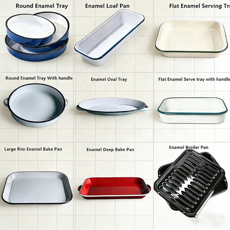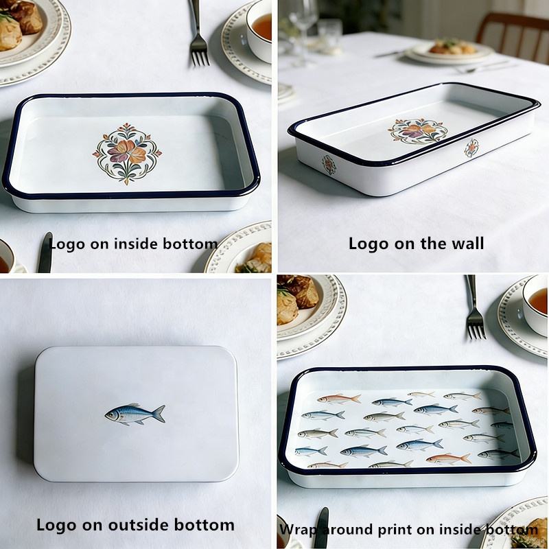 ถาดอบเคลือบสีเขียวขนาดเล็ก ผลิตตามสั่ง ราคาถูก โลโก้สีสันสดใส ผลิตในไทย ทำจากเหล็กกล้าคาร์บอน ปลอดสาร BPA ใช้กับเครื่องล้างจานได้
