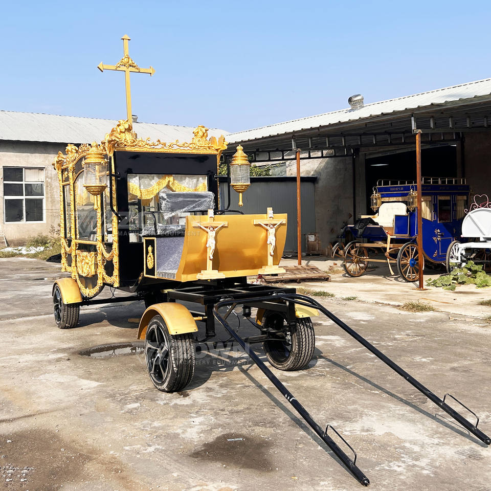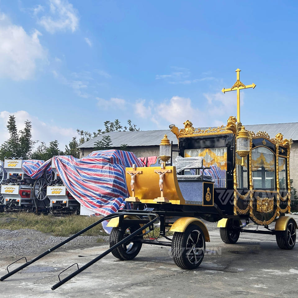 รถม้าไฟฟ้า4ล้อแบบคลาสสิกสีดำและสีทองงาน OEM พิธีศพแบบย้อนยุคระดับไฮเอนด์