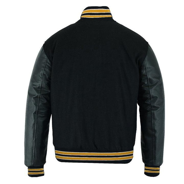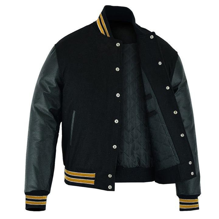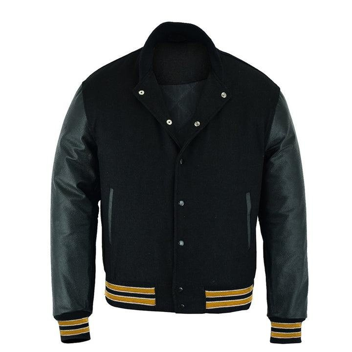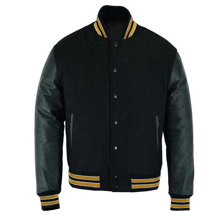 OEM แจ็คเก็ตเบสบอลคอปกตั้งสำหรับผู้ชายคลาสสิกสีดำทองกันน้ำเป็นมิตรกับสิ่งแวดล้อมด้านหน้าฤดูหนาวราคาถูก