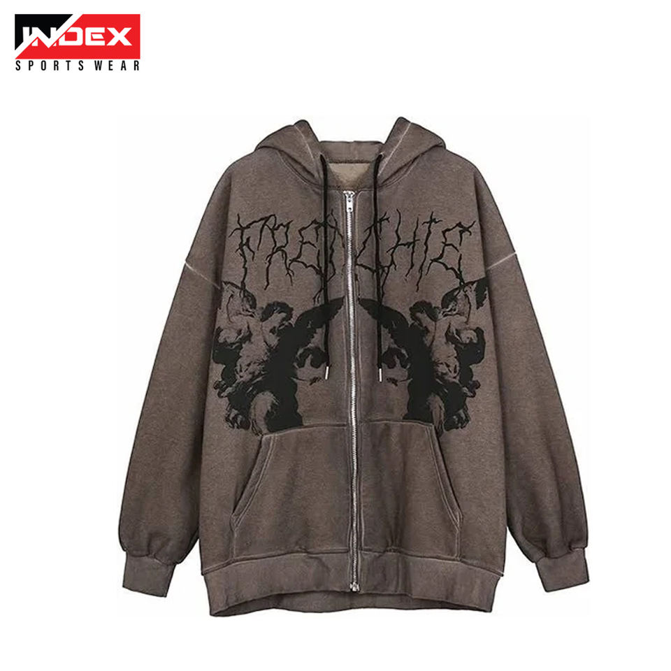 เสื้อสเวตเตอร์มีฮู้ดผ้าคอตตอนเฟรนช์เทอร์รี่ทรงหลวมของผู้ชายเสื้อลายกราฟฟิตีแบบรูดซิปออกแบบโลโก้ได้ตามต้องการ