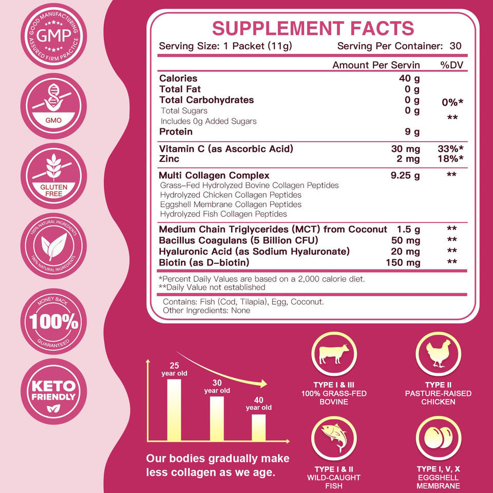 ส่วนผสมหลัก:Collagen Peptides Powder Hydrolyzed Type I II III V X