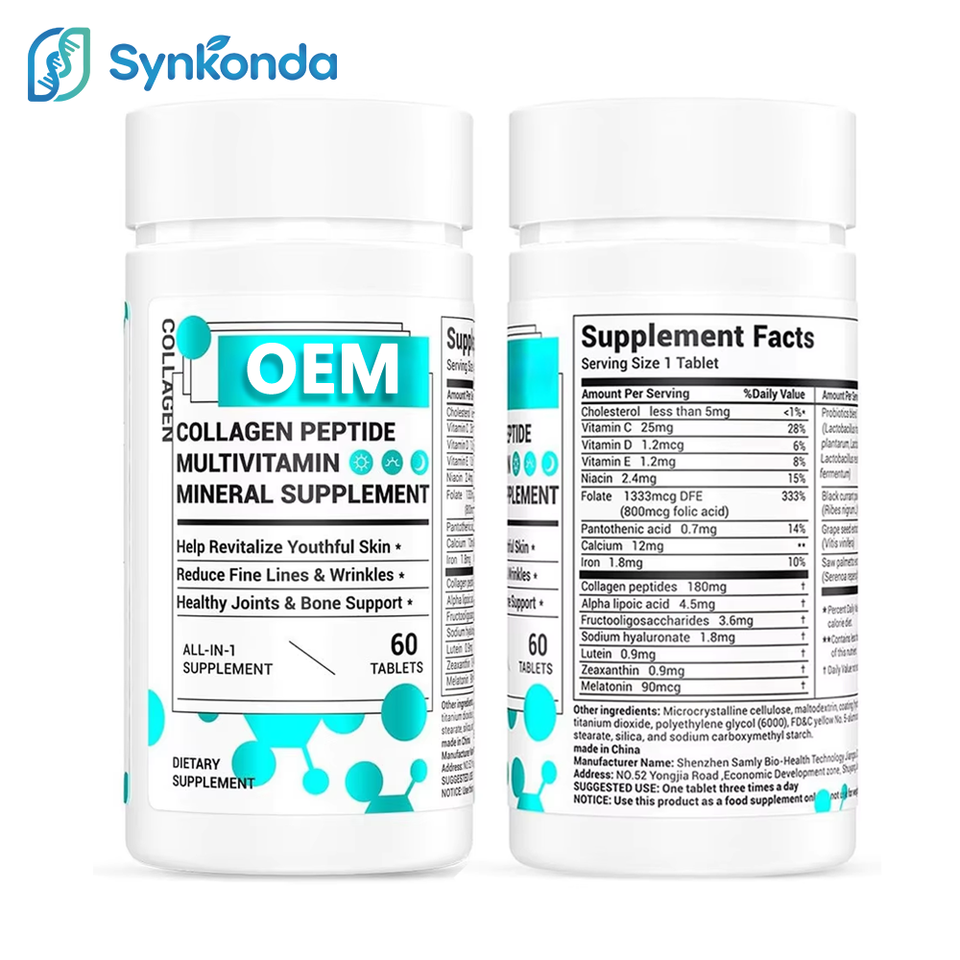 คอลลาเจนเปปไทด์ OEM สำหรับผู้หญิง วิตามินดี3 บีและอี แร่ธาตุเสริม พร้อมโปรไบโอติกส์ 60 เม็ด