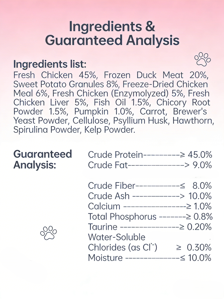 ส่วนผสมหลัก:Chicken Breast,Frozen Duck Meat, Sweet Potato