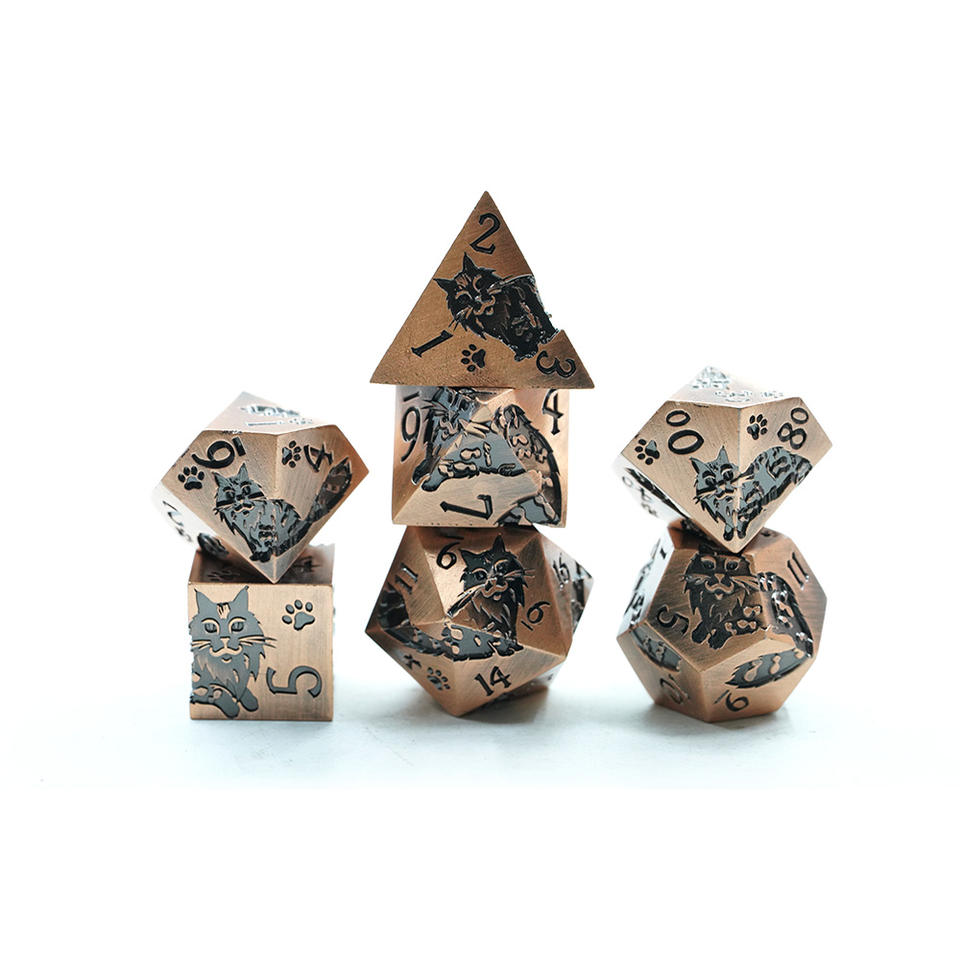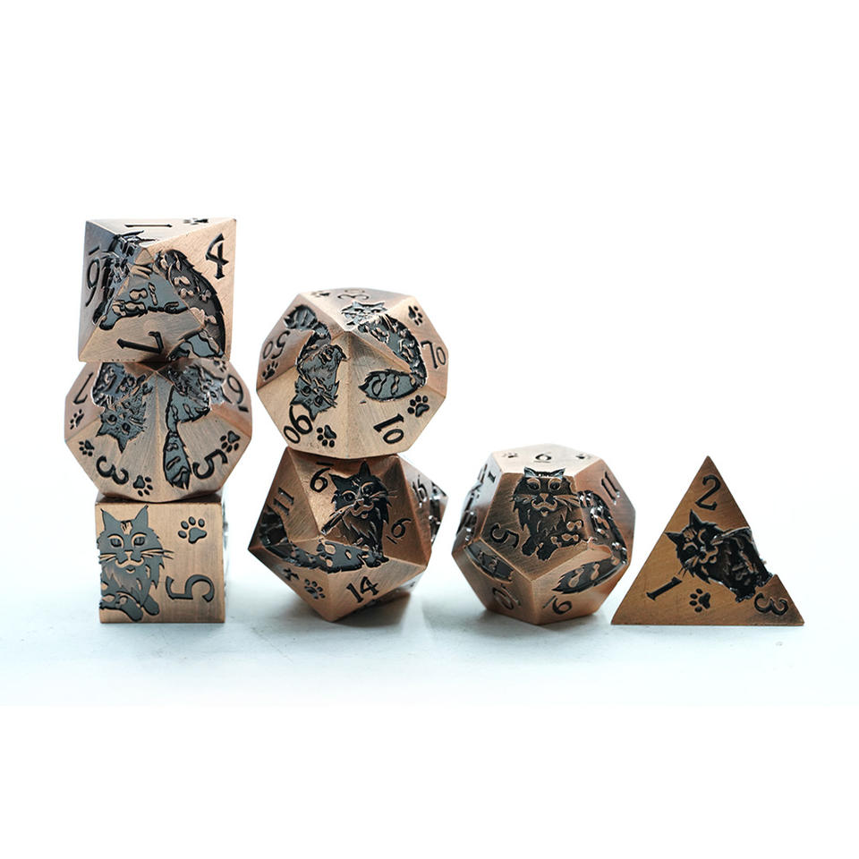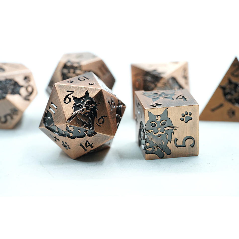 ชุดลูกเต๋าโลหะสีทองแดง OEM 7 ชิ้น ลายแมวดำ ขายส่งสำหรับร้านเกม คาเฟ่ คลับ ของชำร่วยงานปาร์ตี้