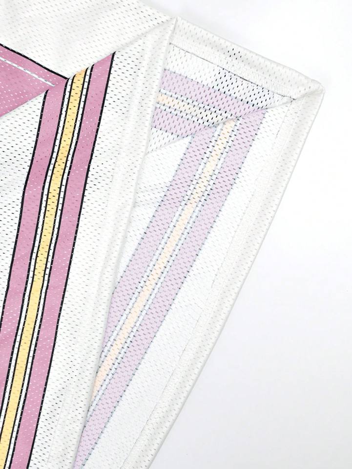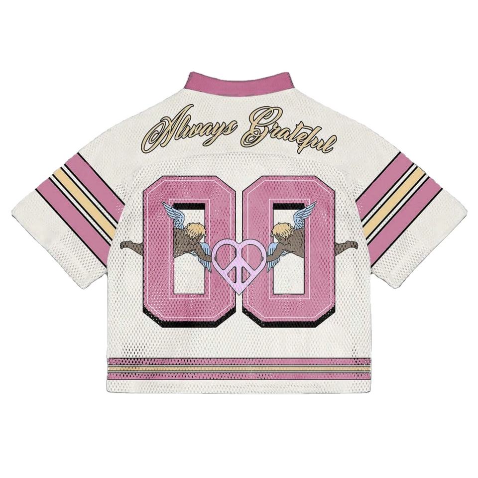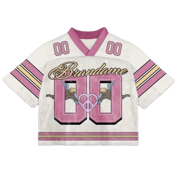 เสื้อเจอร์ซีย์อเมริกันฟุตบอลทรงครอปไหล่ตก แบบ OEM คอวี ผ้าตาข่าย ทรงบ็อกซี่ สตรีทแวร์ ท็อปสั่งทำพิเศษ ลายแถบสีชมพู แบบซับลิเมชั่น