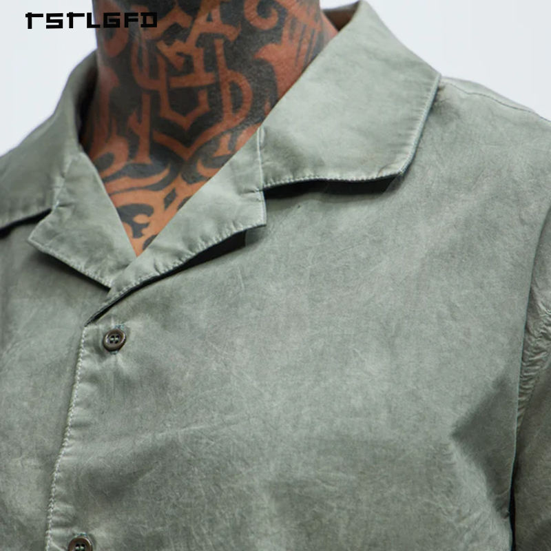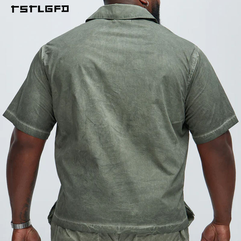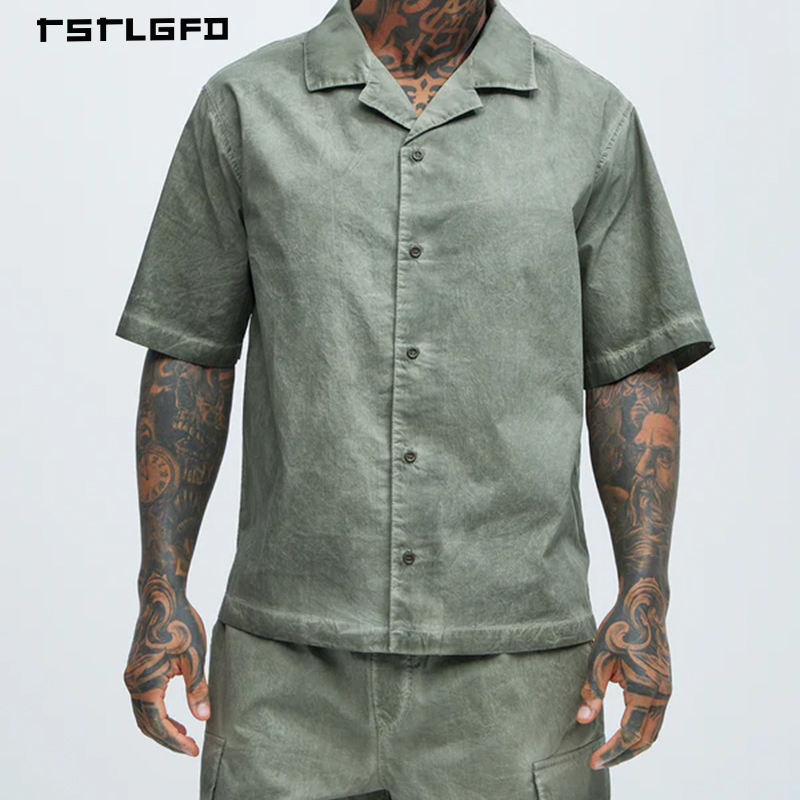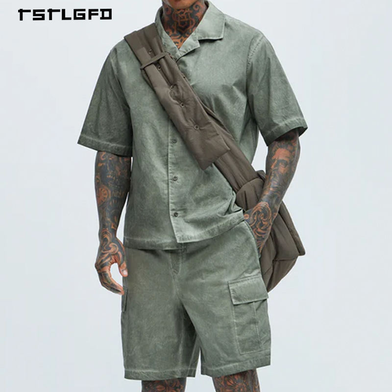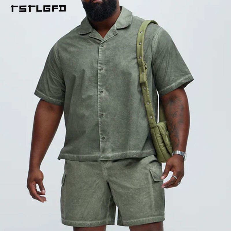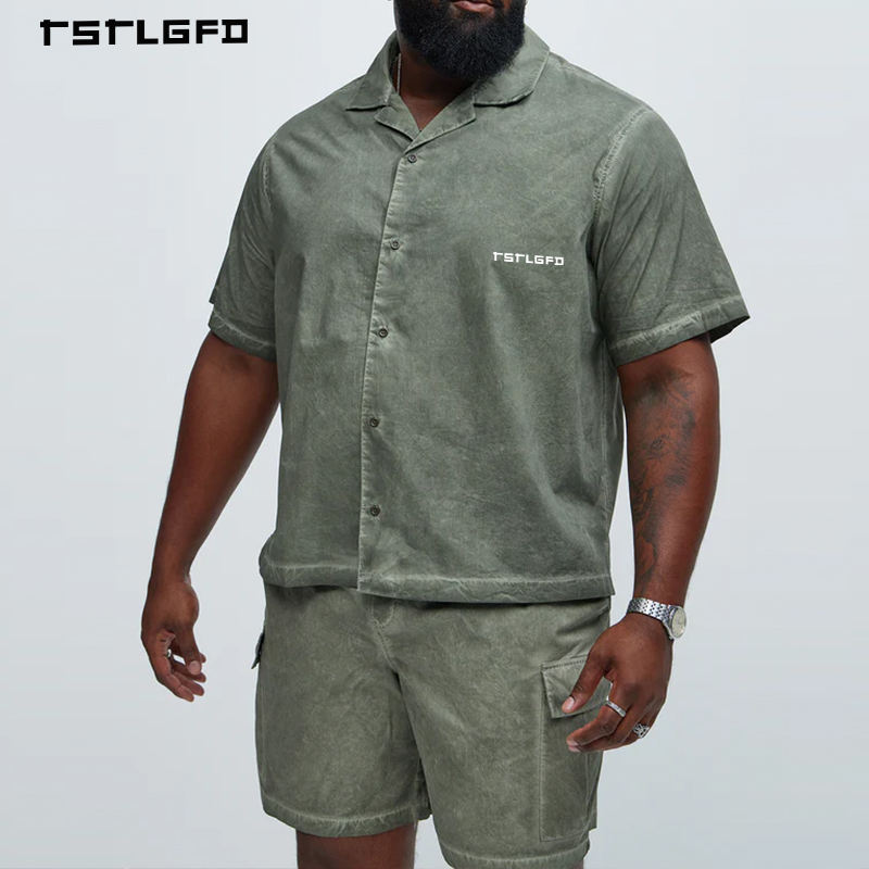 ชุดเซ็ตเสื้อเชิ้ตคอปกพับติดกระดุมและกางเกงขาสั้นคาร์โก้ผ้าฝ้ายแท้ 100% ทรงพลัสไซส์ ล้างสีแบบแอซิดวอช สำหรับผู้ชาย ผลิตตามแบบ OEM
