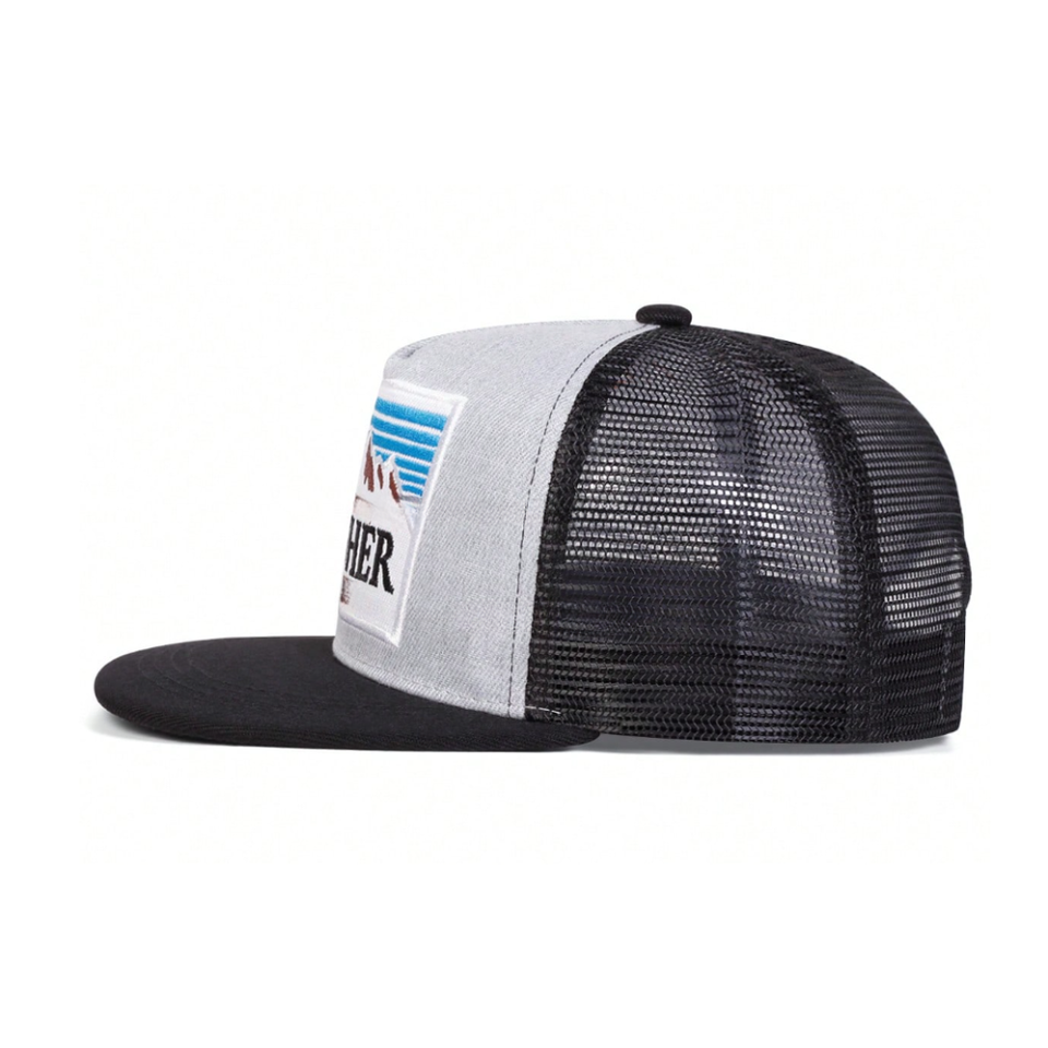 OEM Custom 5 Panel Embroidered Logo Patch Trucker Hat High Profile Mesh Back Unisex Snapback Hat for Sports Daily Wear Branding
