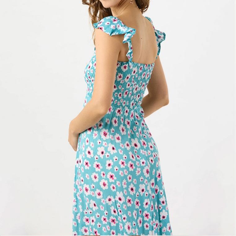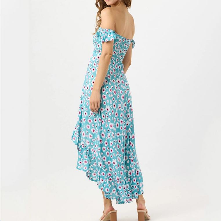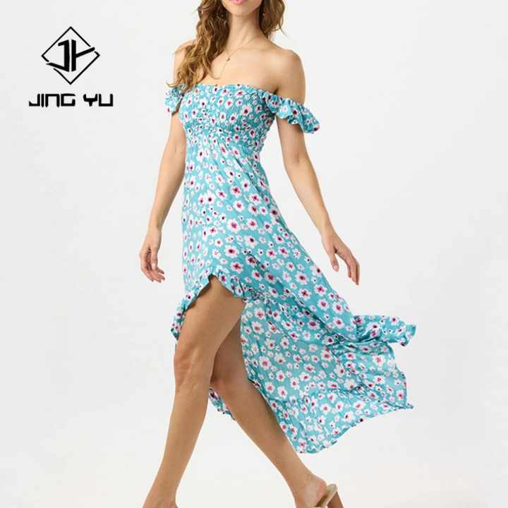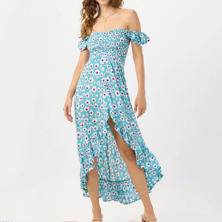 ชุดเดรสยาวทรงพลีทพิมพ์ลายดอกไม้ชายหาดแบบสั่งทำพิเศษสำหรับผู้ผลิต (OEM) สายเดี่ยวผ่าข้าง เนื้อผ้าหรูหรา 100% ผ้าเรยอน สไตล์ลำลอง