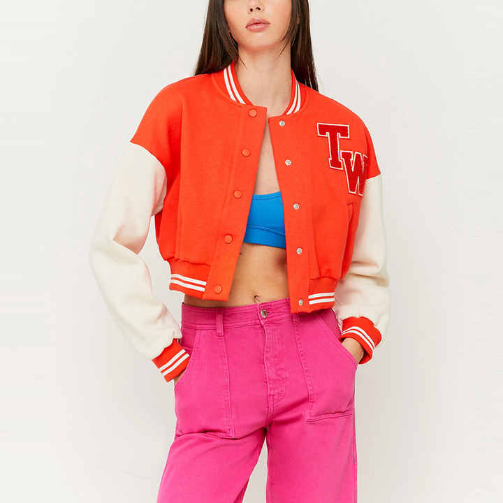 เสื้อโค้ทผ้าฝ้ายสำหรับผู้หญิงแจ็กเก็ตสไตล์ทีมมหาวิทยาลัยแจ็กเก็ตหนังแบบครอป