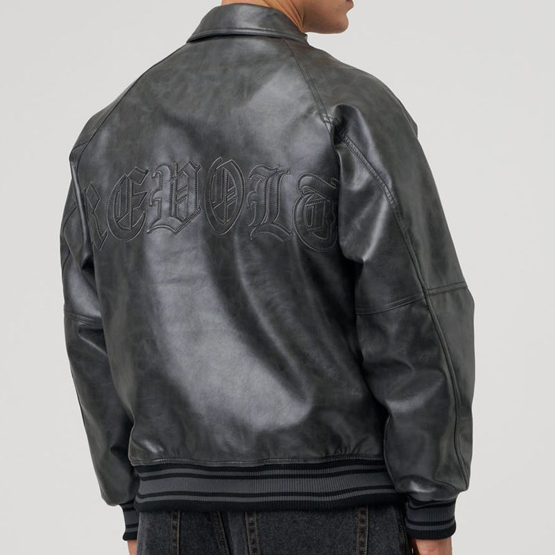 แจ็คเก็ตเบสบอลหนัง PU สีดำปักลายคุณภาพสูง ออกแบบตามสั่ง OEM แจ็คเก็ตบอมเบอร์ Letterman สำหรับผู้ชาย แบบซิป