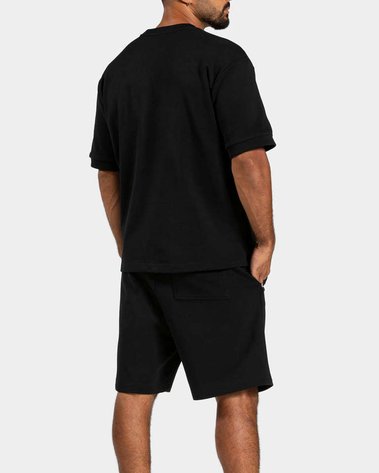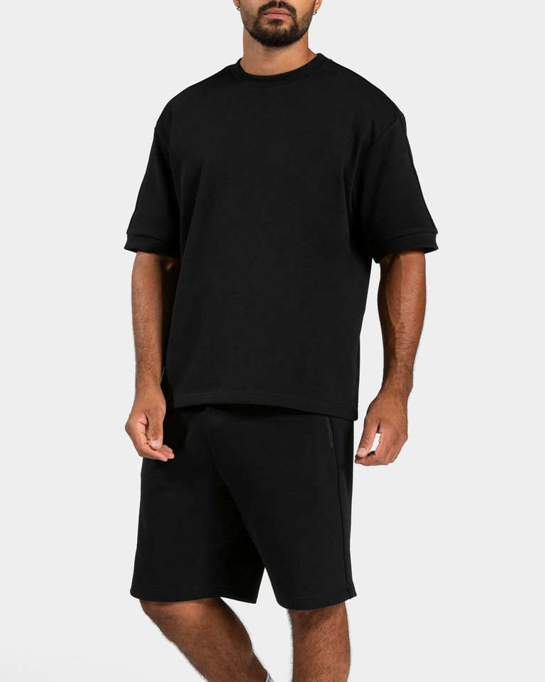 เสื้อยืดและกางเกงขาสั้นผู้ชายสีดำขนาดใหญ่พิเศษ ออกแบบโลโก้ตามสั่ง OEM พร้อมขอบเย็บอย่างดี ผ้าฝ้าย 100% ระบายอากาศได้ดี เหมาะสำหรับออกกำลังกายและสวมใส่ลำลอง