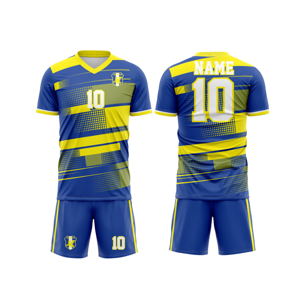 ชุดฟุตบอลคอวีซับลิเมต OEM ออกแบบได้ตามต้องการผลิตจากผ้าโพลีเอสเตอร์ระบายอากาศแห้งเร็วไร้รอยต่อรวมถึงถุงเท้าและกระเป๋า