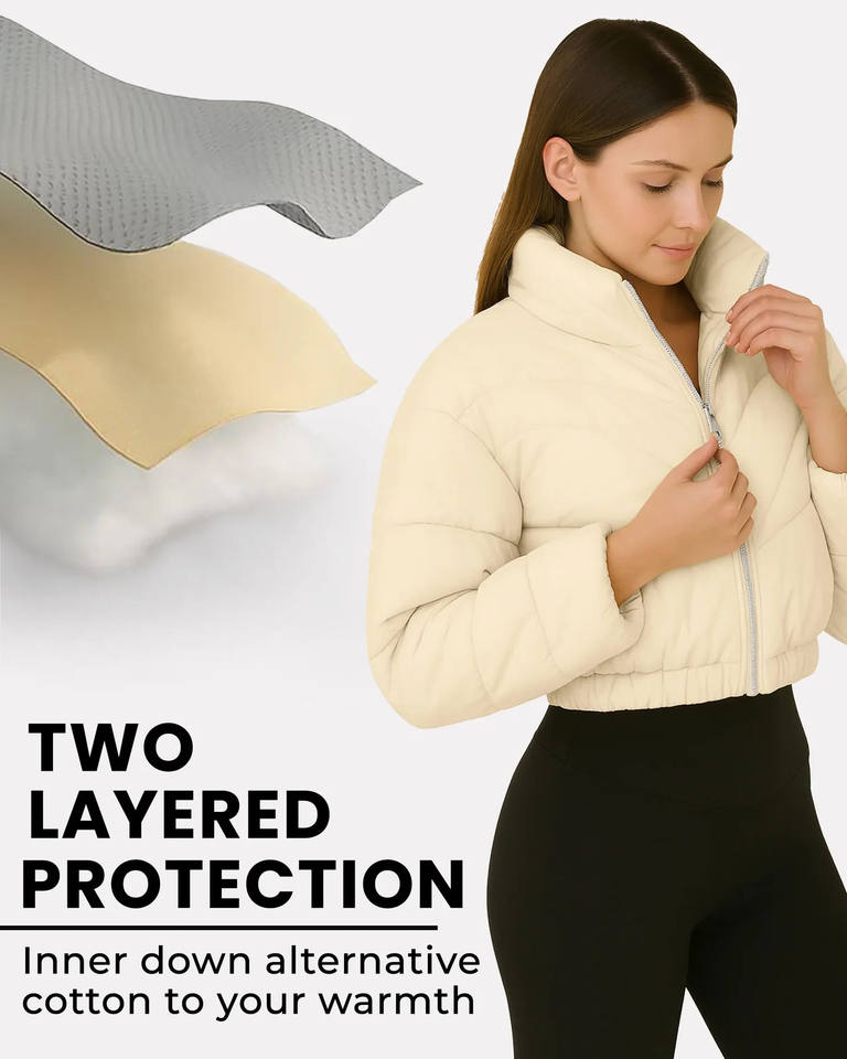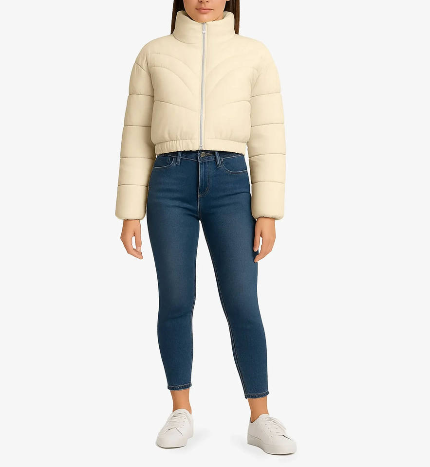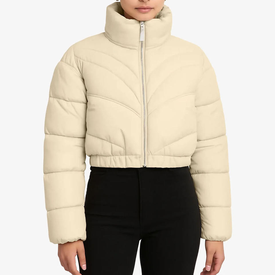 เสื้อแจ็คเก็ตพัฟเฟอร์แบบควิลท์สีเบจสำหรับผู้หญิง ออกแบบตามสั่ง OEM สำหรับใส่ในฤดูหนาวและฤดูใบไม้ร่วง พร้อมชายเสื้อยืดหยุ่น เหมาะสำหรับสวมใส่ลำลองกลางแจ้ง