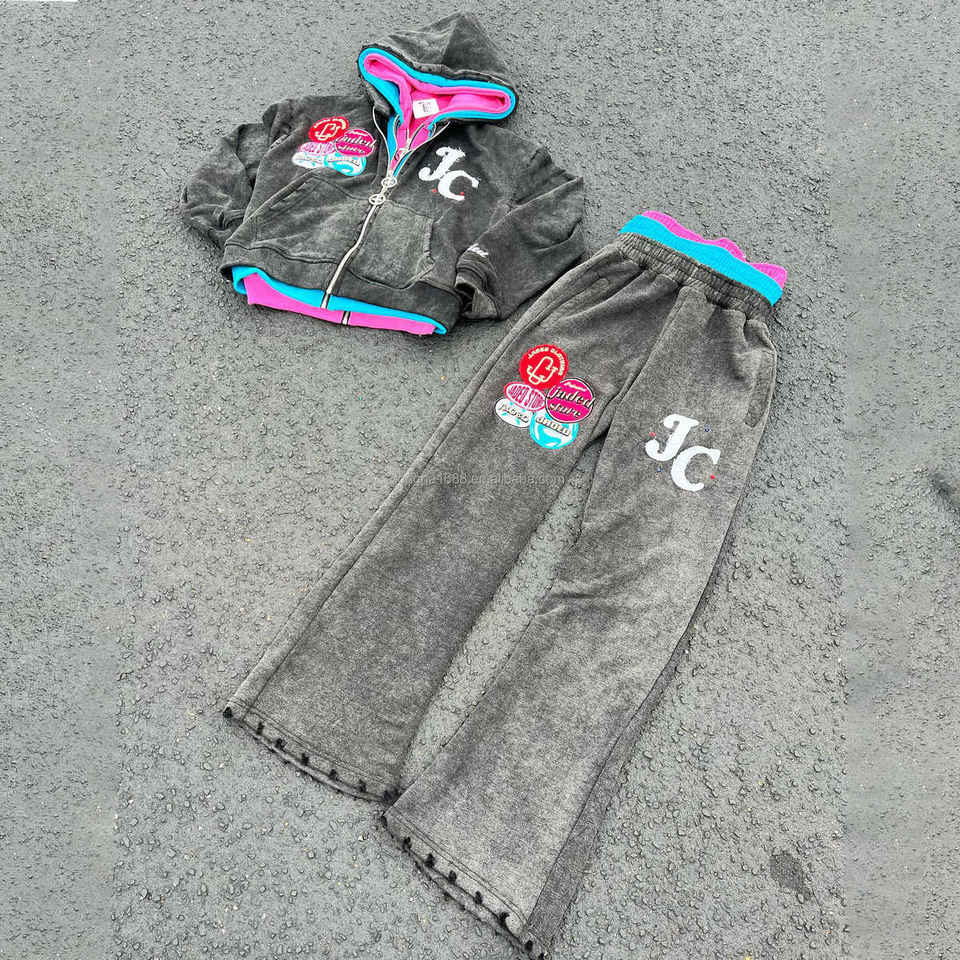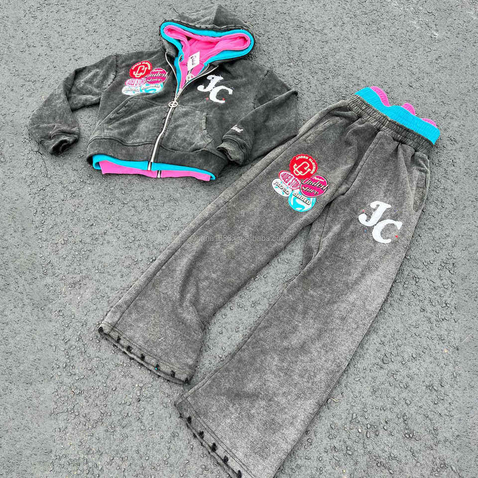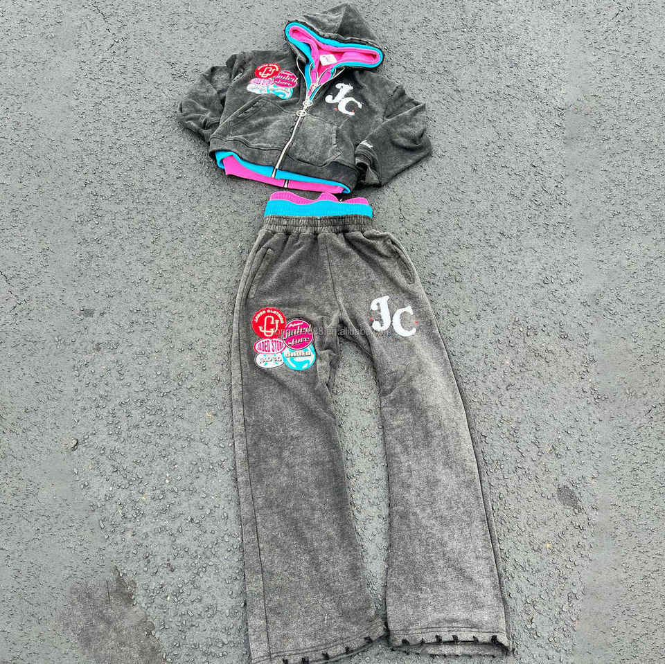ชุดเซ็ตเสื้อฮู้ดดี้และกางเกงจ็อกเกอร์ผ้าฝ้าย 100% คุณภาพสูง แบบซิปสามชั้น สไตล์สตรีทแวร์สำหรับฤดูหนาว ผลิตตามแบบ OEM ดีไซน์ทำเก่า