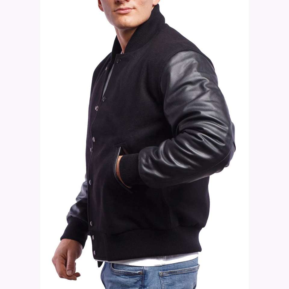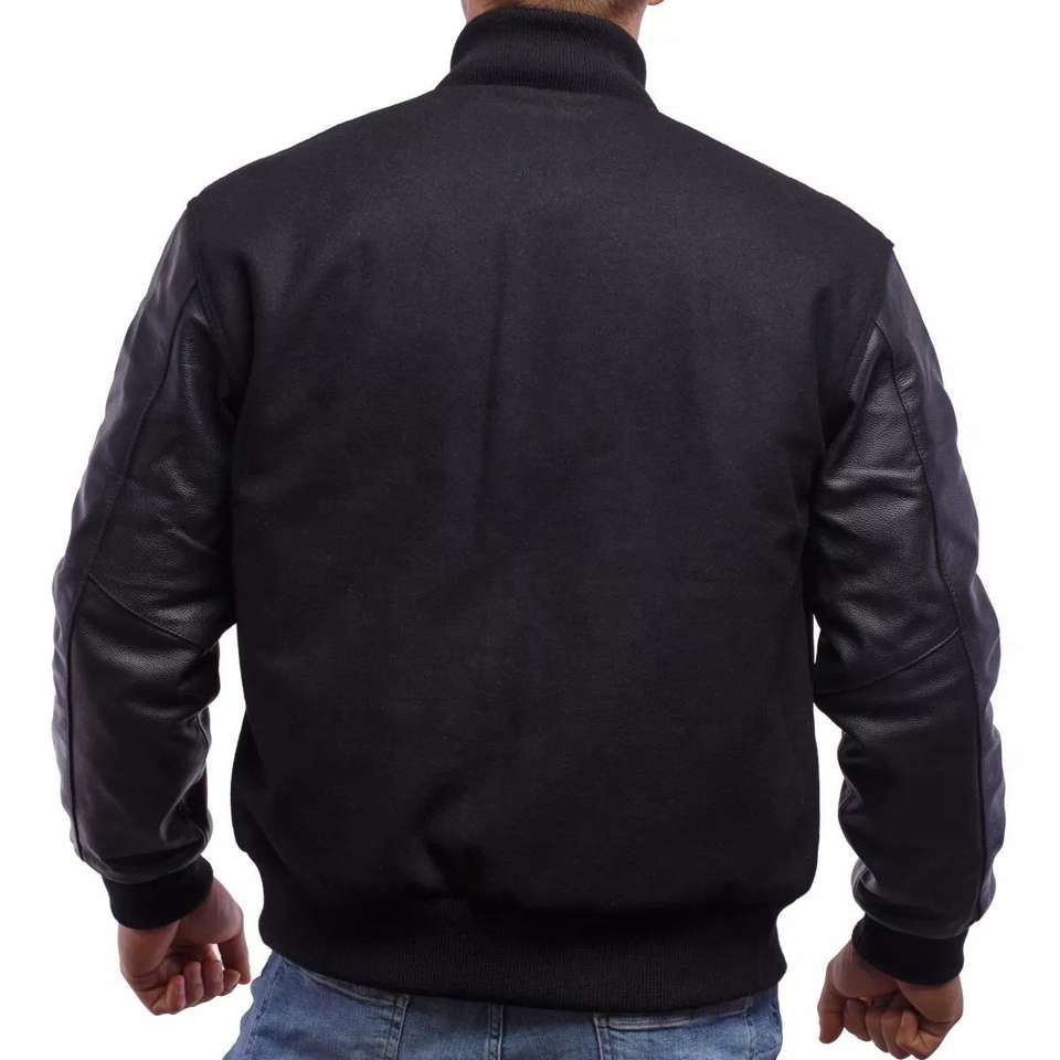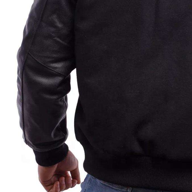 แจ็กเก็ตเบสบอลสีดำแบบไม่มีลายปักปกหนังสำหรับฤดูหนาวสั่งตัดตามสั่ง