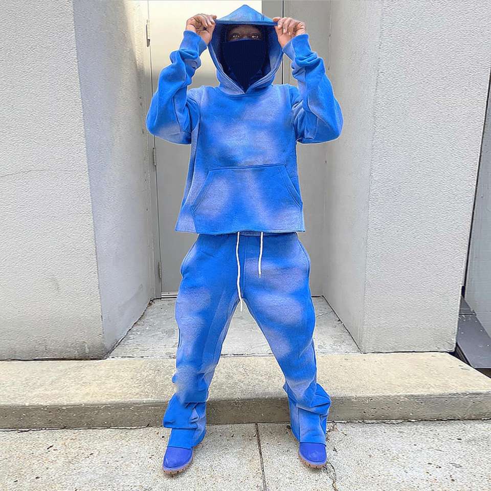 ชุดวอร์มซักกรดสองชิ้นสำหรับผู้ชายชุดวอร์มกางเกงมีฮู้ดชุดวอร์มผ้าซีดแสงแดดออกแบบโลโก้ได้ตามต้องการ