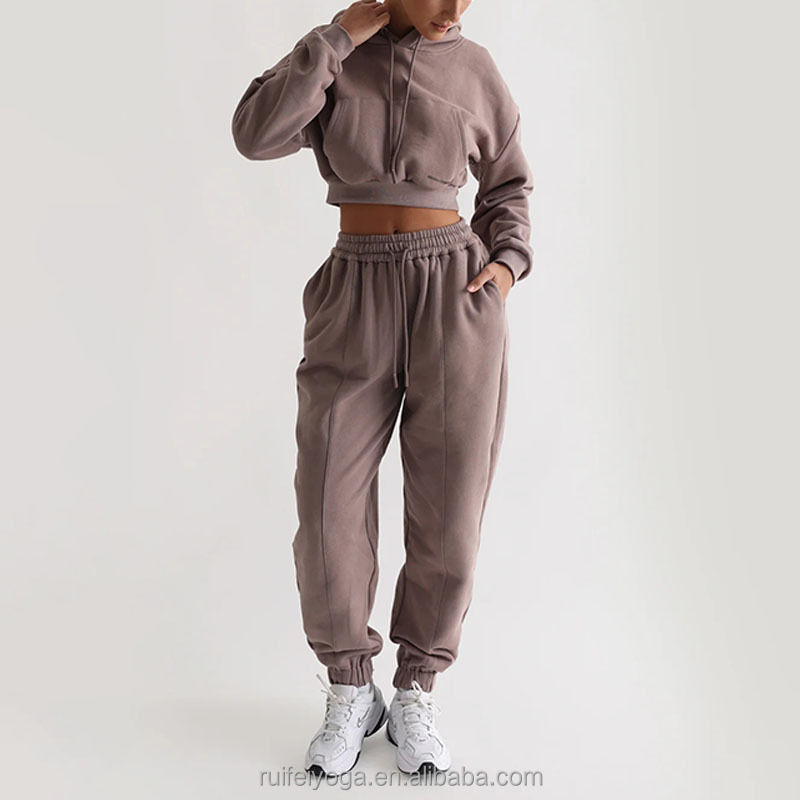 ชุดกีฬาผ้าฟลีซสองชิ้นเสื้อฮู้ดแบบสวมหัวสำหรับผู้หญิงเสื้อฮู้ดออกกำลังกายออกกำลังกายยิมสีทึบ100% โลโก้ตามสั่ง OEM OEM