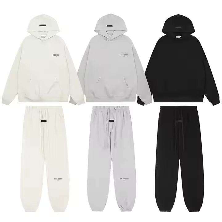 ชุดวอร์มออกกำลังกายฤดูใบไม้ร่วงแบบกำหนดเอง OEM เสื้อฮู้ด FOG กางเกงจ็อกเกอร์ขายาว ชุดยูนิเซ็กส์ สีดำ ผ้าฝ้าย 100% ระบายอากาศได้ดี ผ้าฟลีซ สปอร์ต