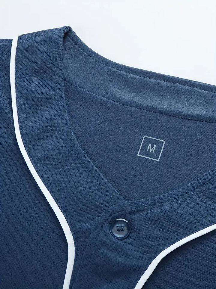 เสื้อเบสบอลแฟชั่นสีฟ้ามีแถบสีขาวเสื้อเจอร์ซีย์เสื้อเบสบอลแบบเต็มปุ่มออกแบบได้ตามต้องการ