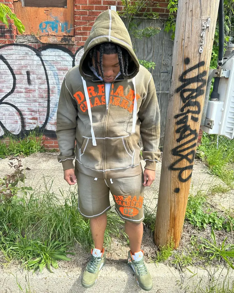 OEM Custom Full Zip up Hoodie and Short Sets Two Piece Acid Stone Washed Sweatsuit Distressing Embroidery Tracksuits for Men