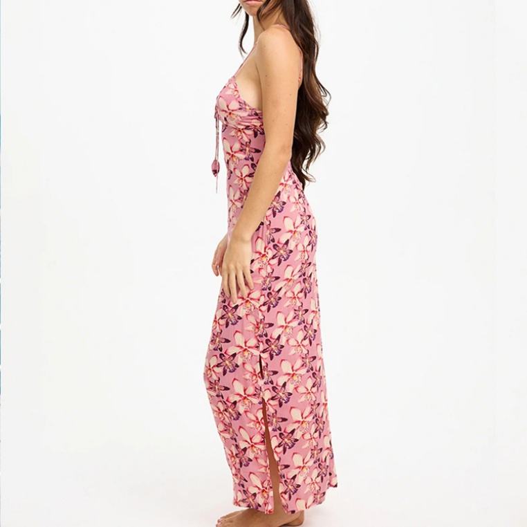 ชุดเดรสยาวผ้าเรยอนเนื้อนุ่มทรงเข้ารูปพิมพ์ลายฮาวายแบบสั่งทำพิเศษจากโรงงาน (OEM) พร้อมสายรัดยางยืดและดีไซน์ผ่าข้าง - แฟชั่นหรูหรา