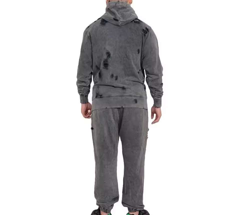ชุดวอร์มซิปแบบย้อมสีเอซิดคุณภาพสูงสำหรับผู้ชาย สไตล์ดิสเทรส พร้อมแพทช์และโลโก้ด้านหน้า