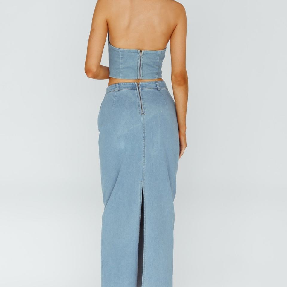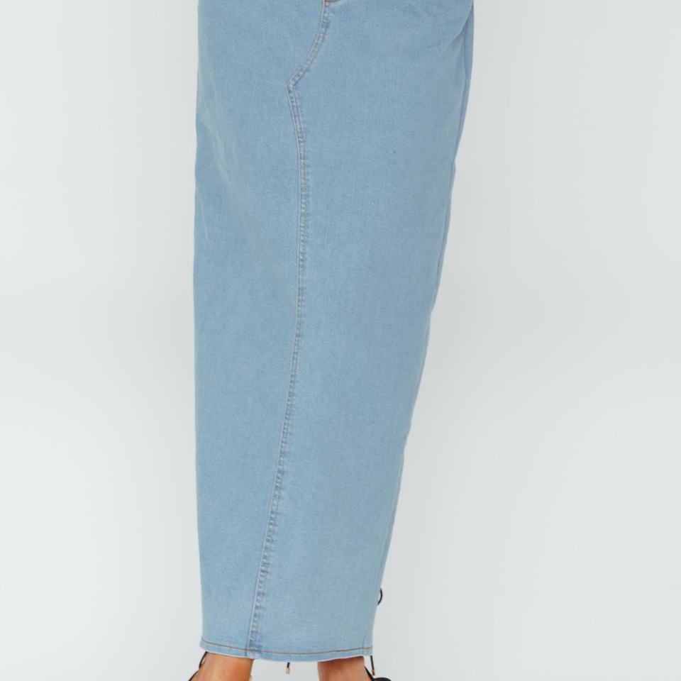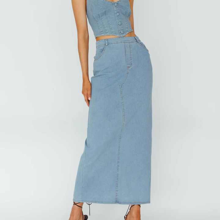 กระโปรงยีนส์ยาวสีน้ำเงินคุณภาพสูงแบบ OEM สไตล์วินเทจลำลองสำหรับผู้หญิง กระโปรงยาวผ่าหลังแบบฟอกสี