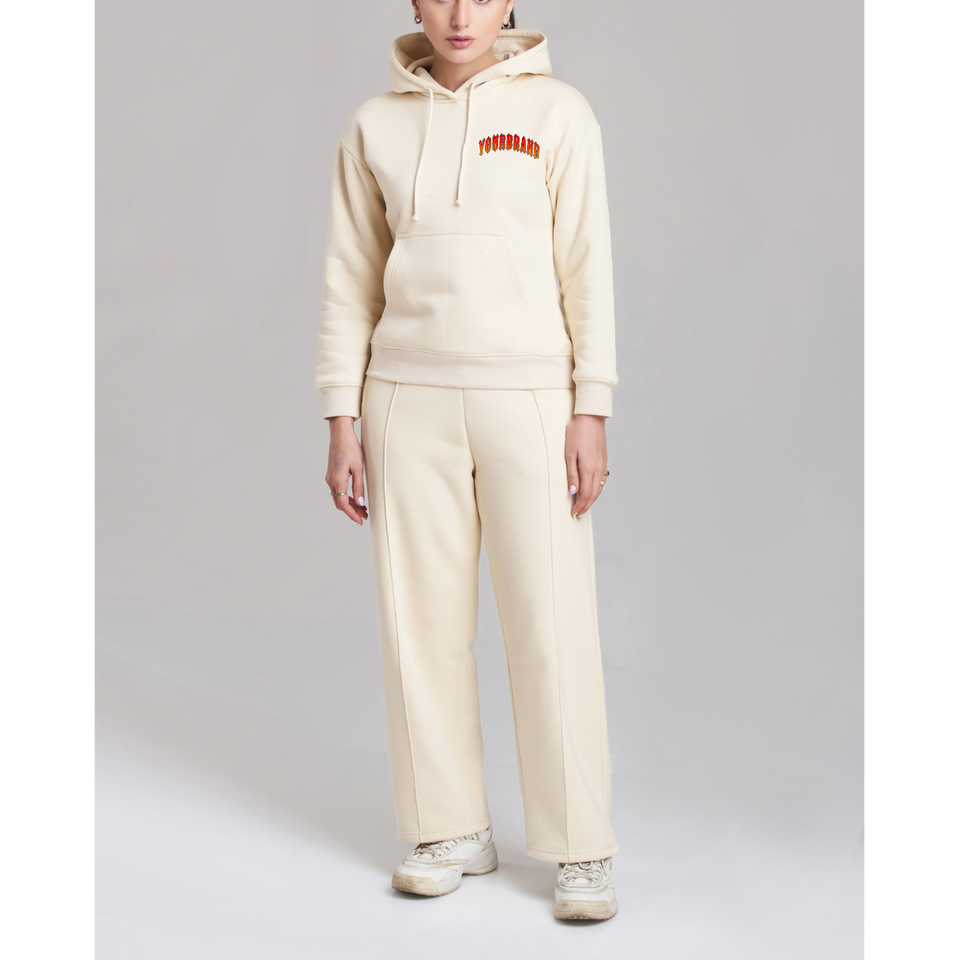 ผู้ผลิตเสื้อผ้า OEM คุณภาพสูง ชุดวอร์มผู้หญิงแบบมีซิปพิมพ์ลายพัฟฟ์ ผ้าเฟรนช์เทอร์รี่ กางเกงขาบาน สไตล์ครอปฮู้ดดี้ ผลิตในสหรัฐอเมริกา