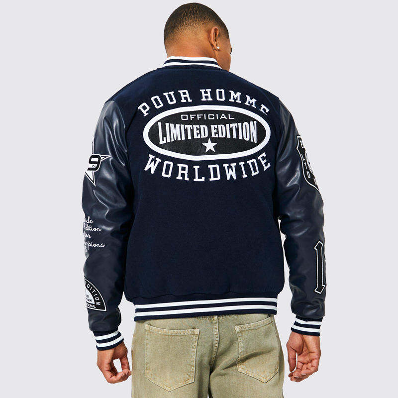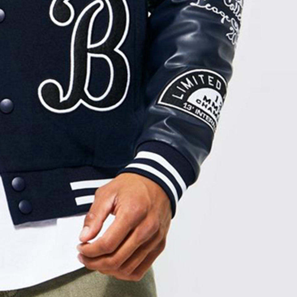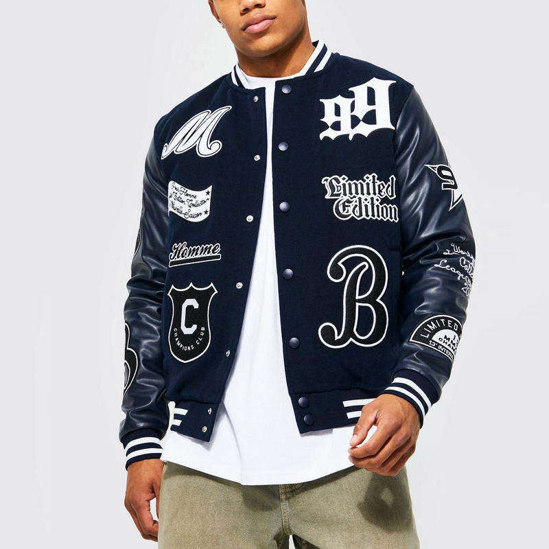แจ็คเก็ตเบสบอลวินเทจแบบมีซิป ตกแต่งด้วยงานปักไหมเชนีล พร้อมปลอกแขนหนังแท้แบบสั่งทำพิเศษสำหรับผู้ชาย