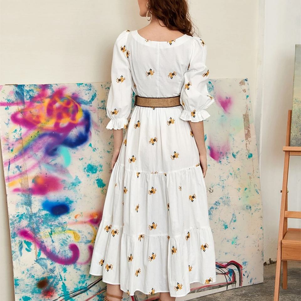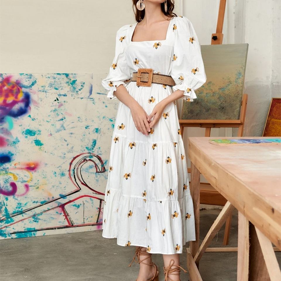 ชุดเดรสผ้าลินินสั่งทำ OEM ชุดเดรสยาวปานกลางสำหรับฤดูร้อน คุณภาพสูง ชุดเดรสคอเหลี่ยมปักลายดอกไม้พร้อมเข็มขัดสำหรับผู้หญิง