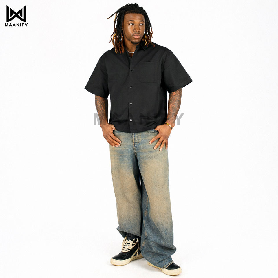 เสื้อเชิ้ตทำงานสีดำแบบครอปทรงบ็อกซี่ สตรีทแวร์ ผ้าโพลีเอสเตอร์ผสมคอตตอน ติดกระดุม สำหรับผู้ชาย รับทำโลโก้ OEM ขายดีที่สุดจาก MAANIFY