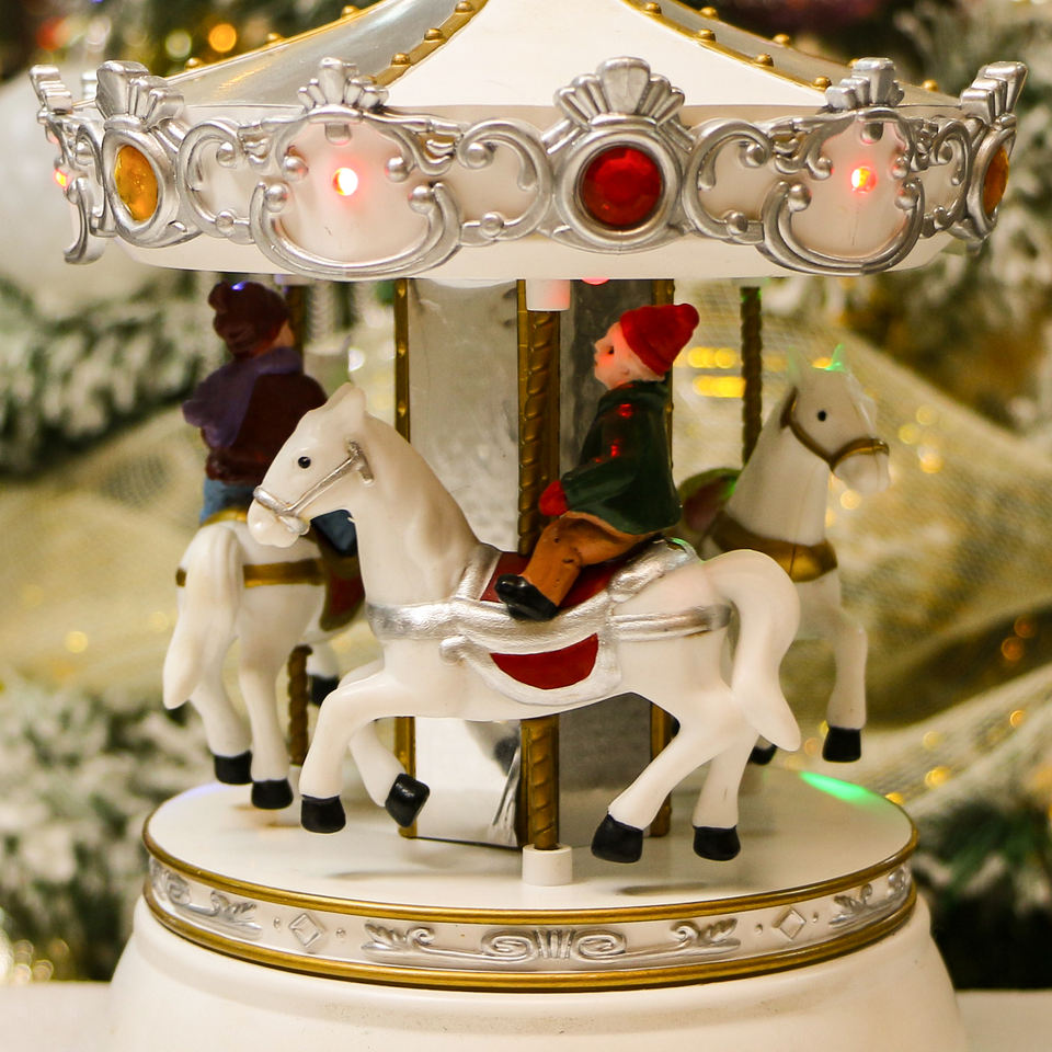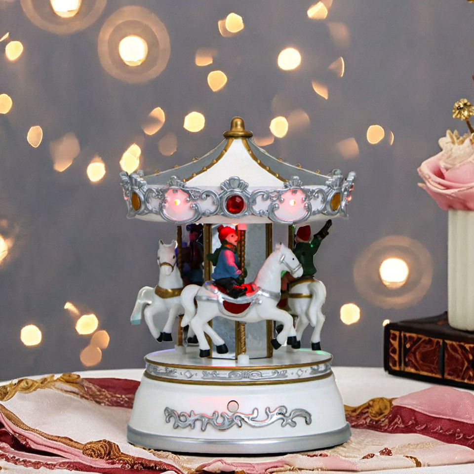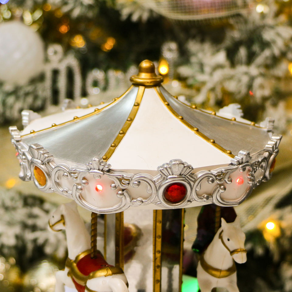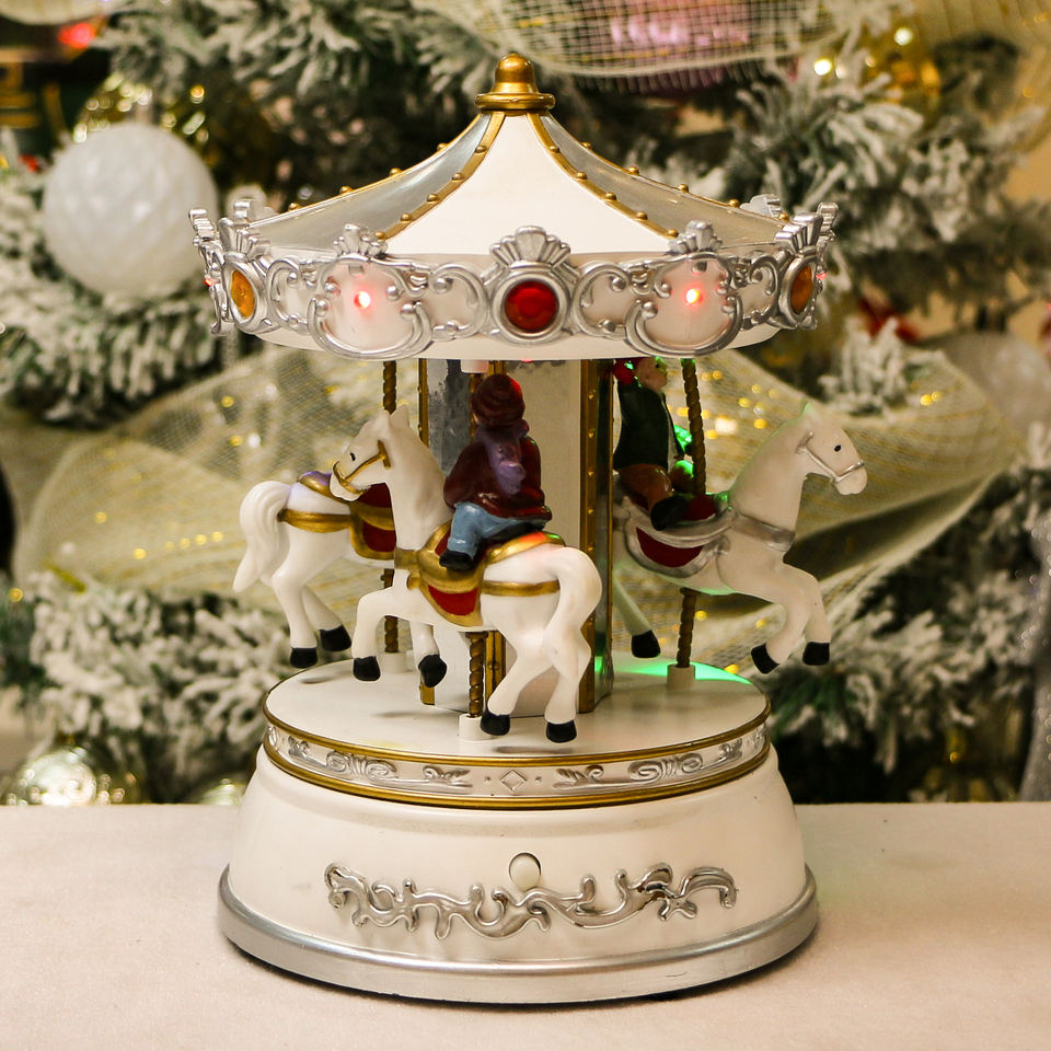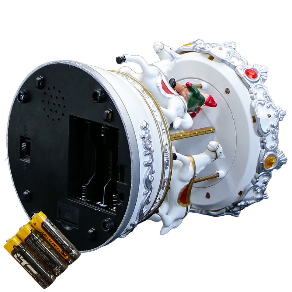 กล่องดนตรีหมุนรูปม้าหมุนคริสต์มาส ผลิตตามสั่ง พร้อมโลโก้ วัสดุเรซิ่นและพลาสติก ใช้พลังงานแบตเตอรี่ และมีเพลงตามสั่ง