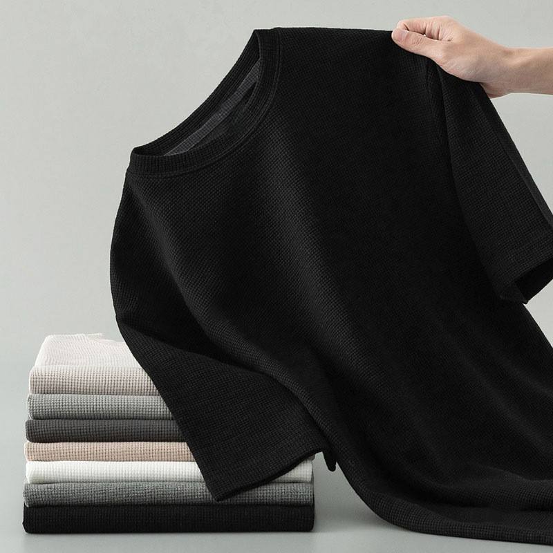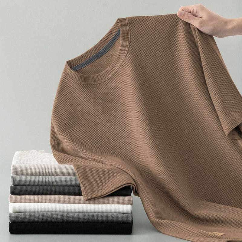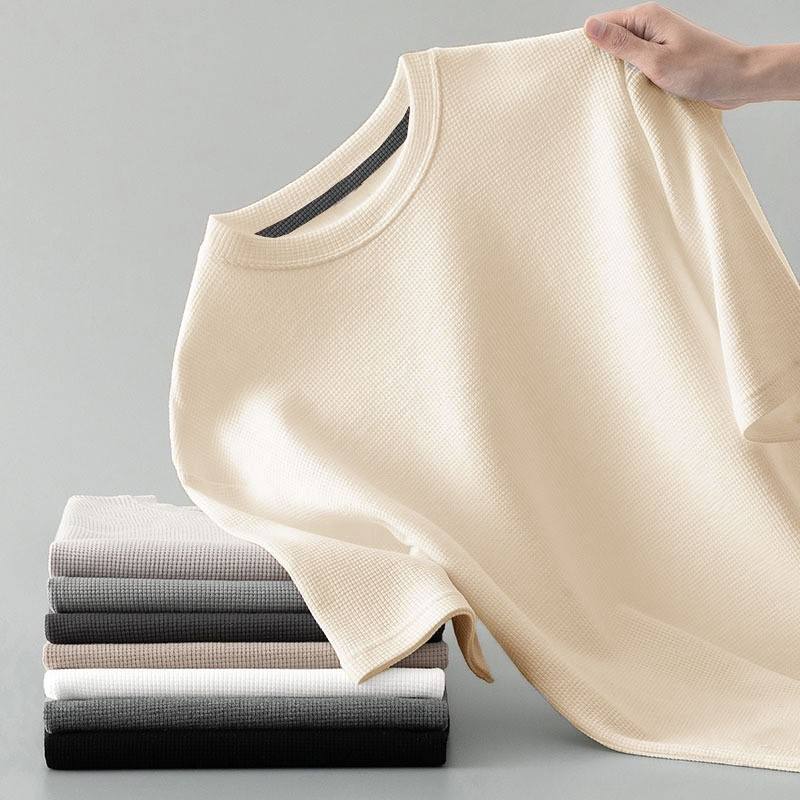 เสื้อยืดคอโอเว้า แขนสั้น ผ้าวาฟเฟิล พิมพ์ลายดิจิตอล โลโก้สั่งทำ OEM สำหรับผู้ชาย สไตล์ลำลองธุรกิจ ใส่สบาย น้ำหนัก 220 กรัม รุ่นเปล่า