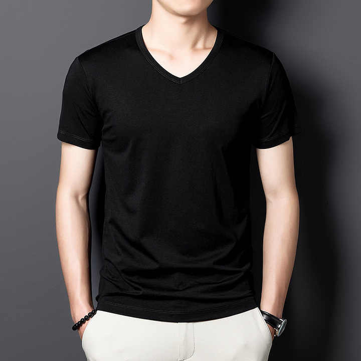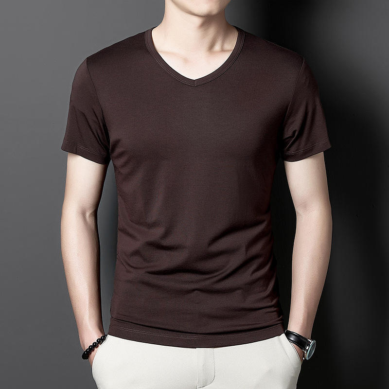 เสื้อยืดคอวีผู้ชาย แขนสั้น ผ้าโมดอลผสมไหมน้ำแข็ง สีพื้น สำหรับฤดูร้อน ดีไซน์พิมพ์ลายปักโลโก้ตามสั่ง OEM ระดับไฮเอนด์