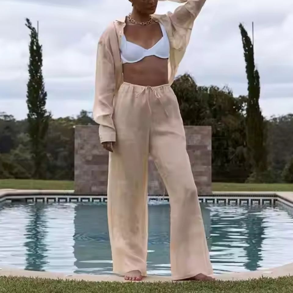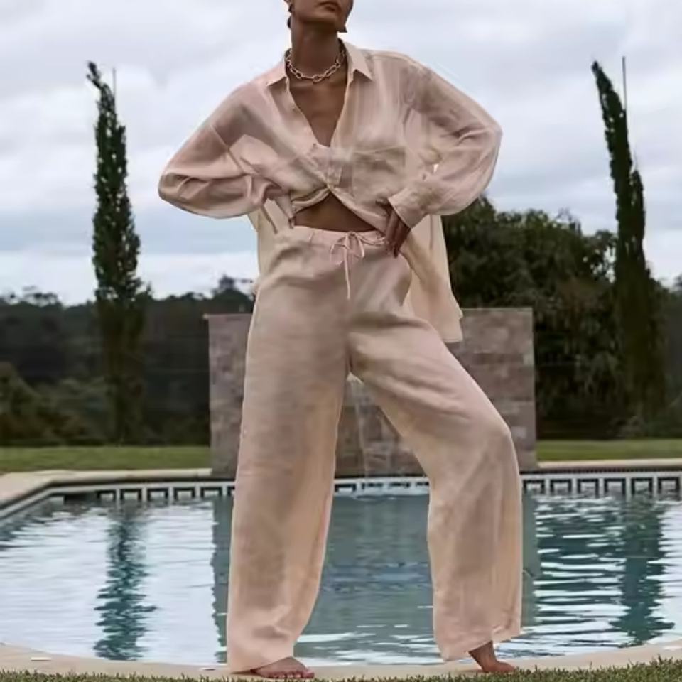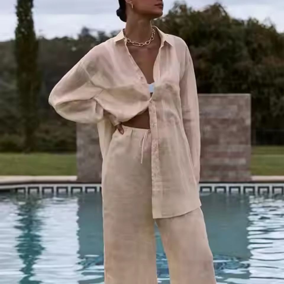 ชุดผ้าลินินคุณภาพสูงแบบลำลองพร้อมโลโก้ OEM ตามสั่ง เสื้อเชิ้ตผ้าลินินติดกระดุมทรงหลวม กางเกงขายาวเอวสูงทรงหลวม ชุดผ้าลินิน