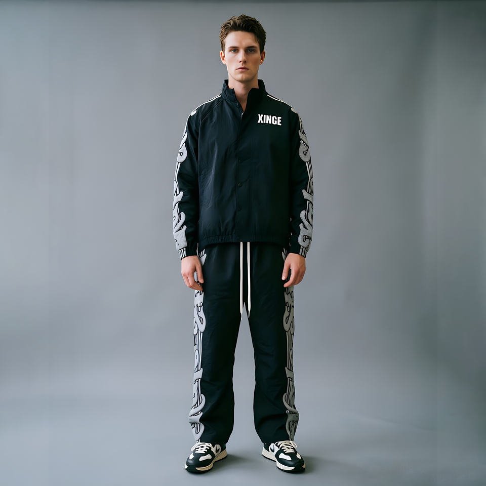 ชุดวอร์มผู้ชายแบบสปอร์ต ระบายอากาศได้ดี ผลิตตามแบบ OEM พร้อมโลโก้ตามสั่ง ผ้าไนลอน แถบสะท้อนแสง ขอบสีขาว ผ้าวาฟเฟิลระบายอากาศได้ดี