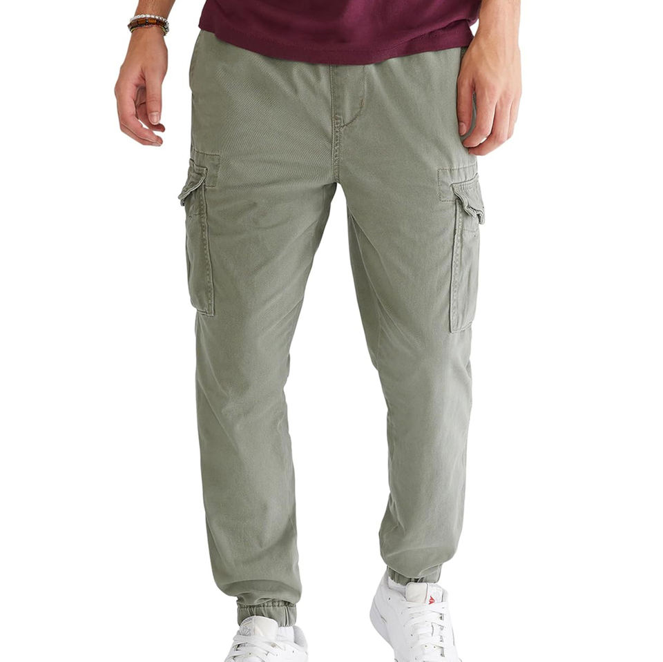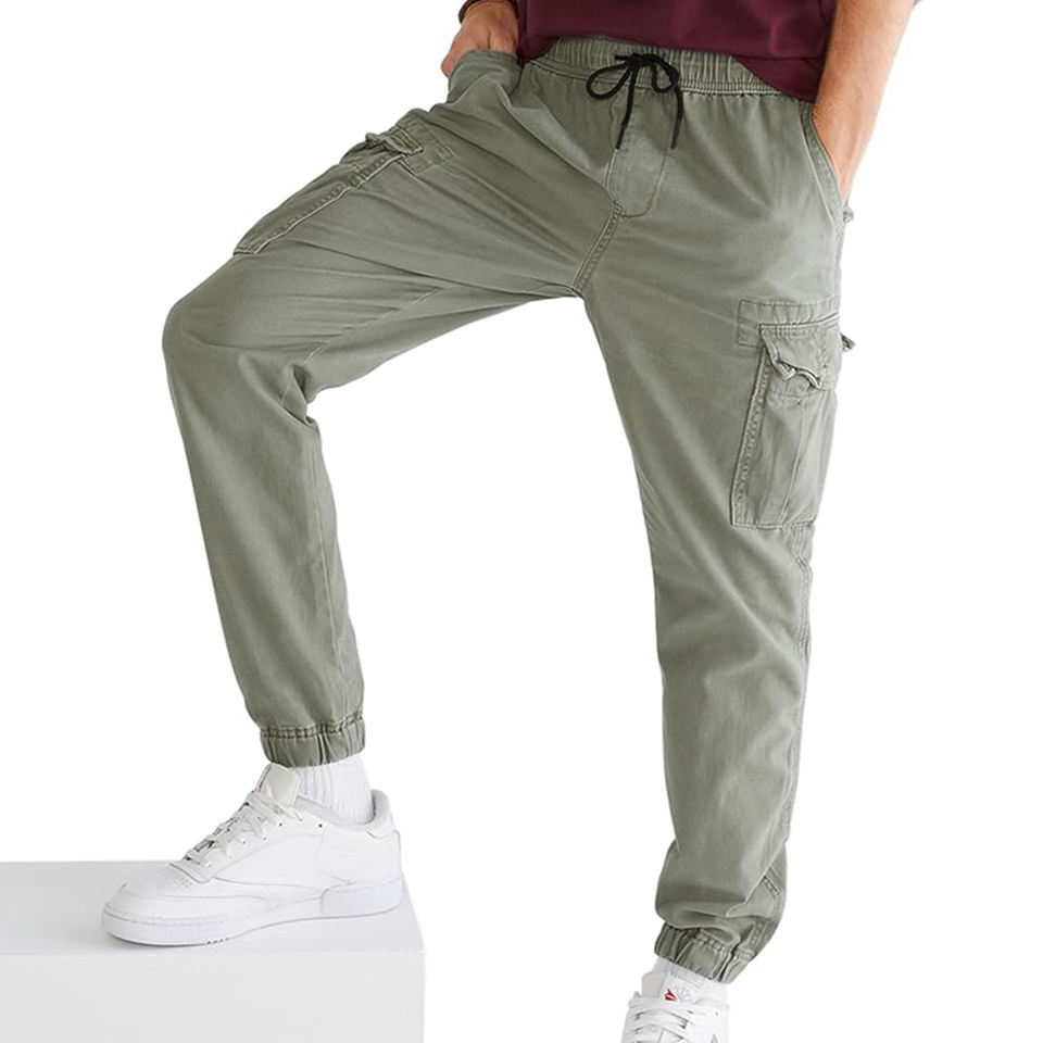 กางเกงคาร์โก้ผู้ชายสไตล์สตรีทแวร์ หลายกระเป๋า รับทำโลโก้ OEM เอวยางยืดพร้อมเชือกผูก สีพื้น ล้างสี