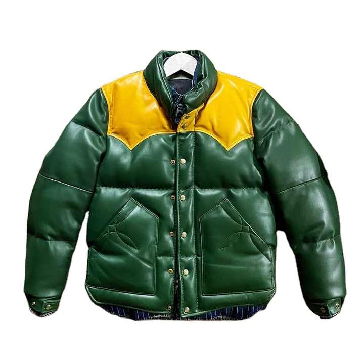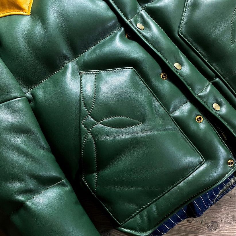 OEM Custom Logo Premium Winter Coat Green Designer Puffer Leather Jacket for Men Handmade Genuine Sheep Skin Stylish Warm Front