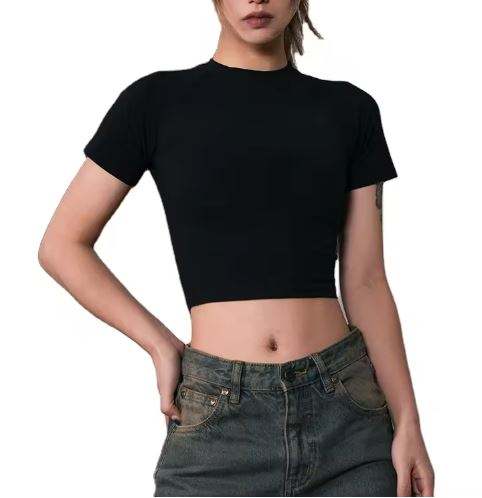 เสื้อครอปสำหรับผู้หญิงเสื้อออกกำลังกายน่ารักสีทึบเซ็กซี่สีดำถักลายโลโก้ออกแบบได้ตามต้องการ