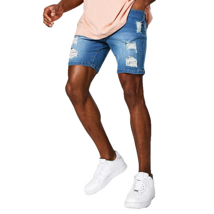 กางเกงขาสั้นผ้ายีนส์แบบหลวมสำหรับผู้ชายกางเกงยีนส์ลำลองสีฟ้าคลาสสิกผ้าฝ้าย100% ออกแบบได้ตามต้องการ