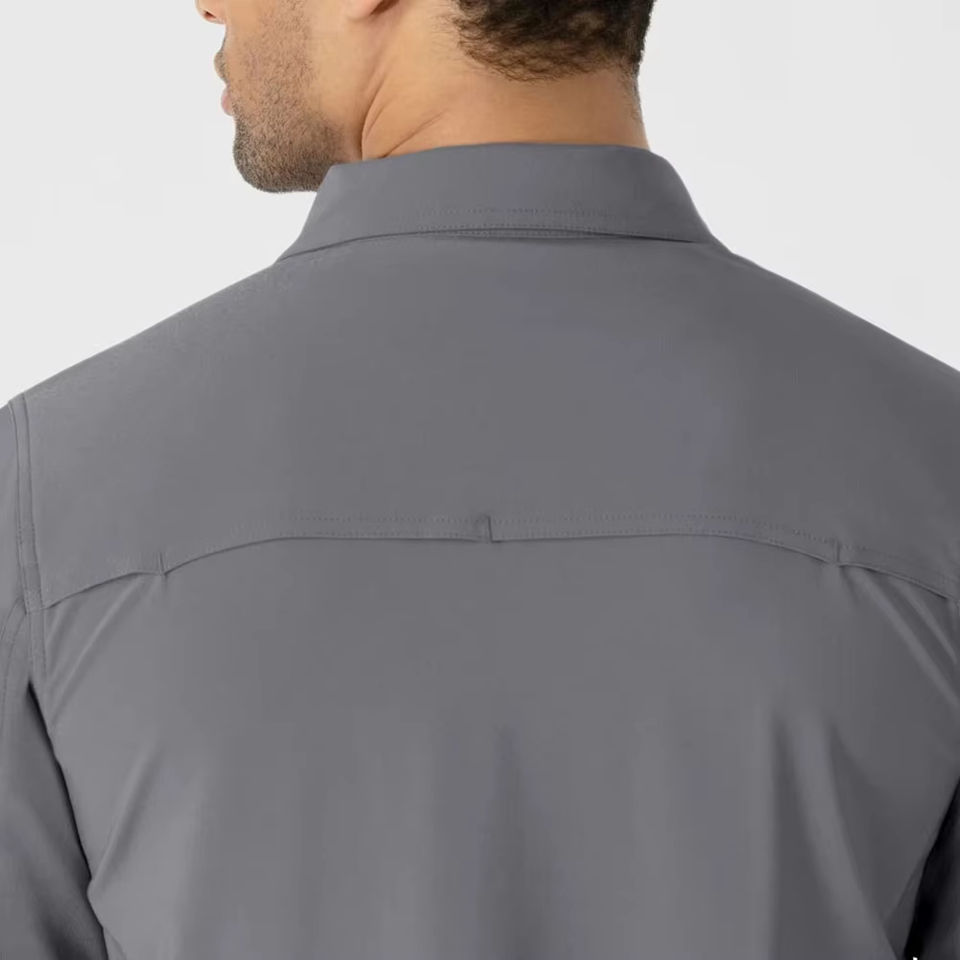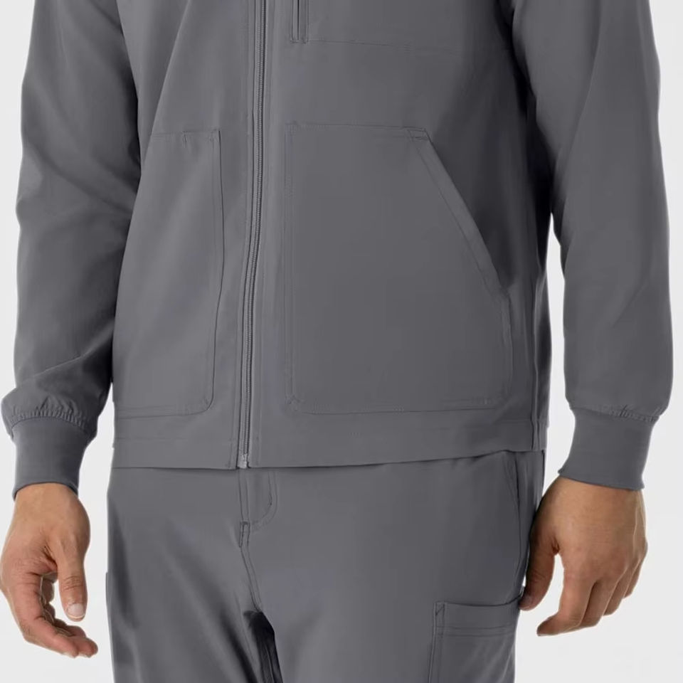 เสื้อสครับแพทย์ชายแบบสั่งทำโลโก้ OEM แขนยาว ป้องกันการซึมซับเหงื่อ เสื้อแจ็คเก็ตผ่าตัด ชุดยูนิฟอร์มสำหรับแพทย์ พยาบาล และนักศึกษาพยาบาล