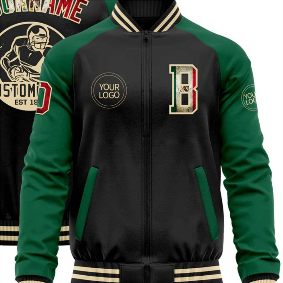 รับผลิตเสื้อแจ็คเก็ตแบบมีซิปสองสีสไตล์วาร์ซิตี้ตามสั่ง ผลิตจำนวนมาก สีดำ-แดง-ครีม แบบบอมเบอร์ พร้อมปกคอทำจากหนังแกะ