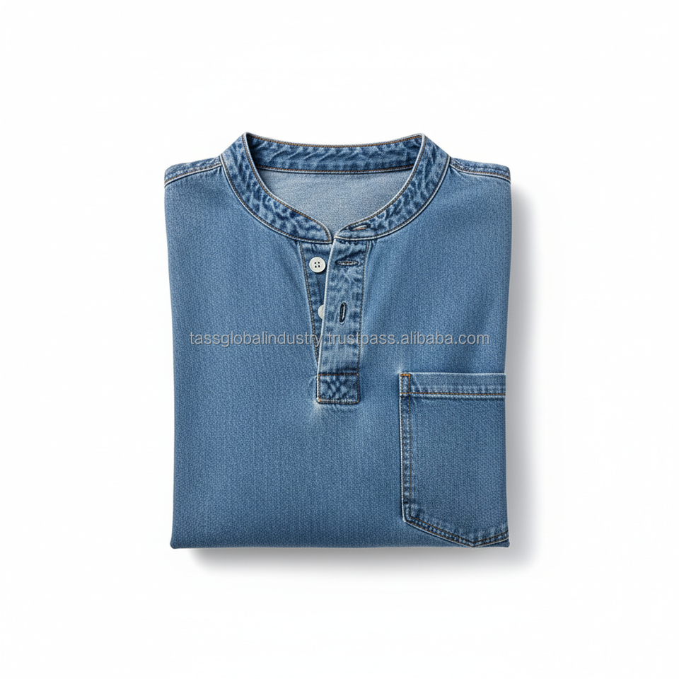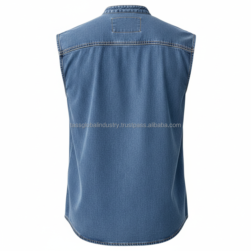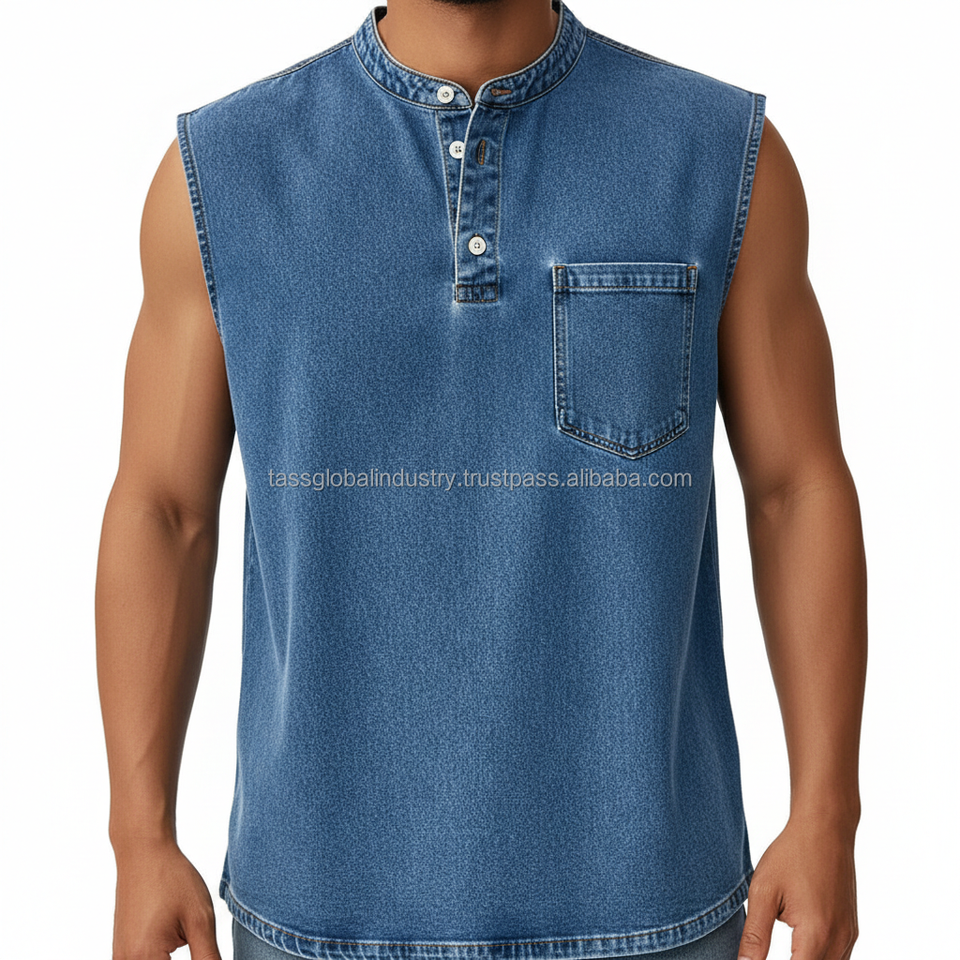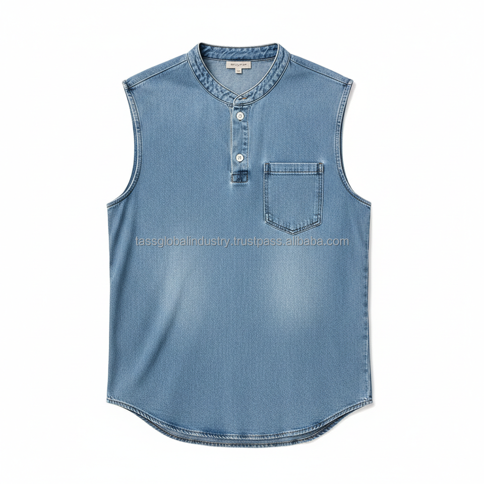 เสื้อกั๊กยีนส์เดนิมแบบเฮนลีย์สำหรับผู้ชาย สไตล์วินเทจ สีน้ำเงินฟอก ทรงลำลอง มีกระเป๋าหน้าอก รับผลิตตามแบบ OEM