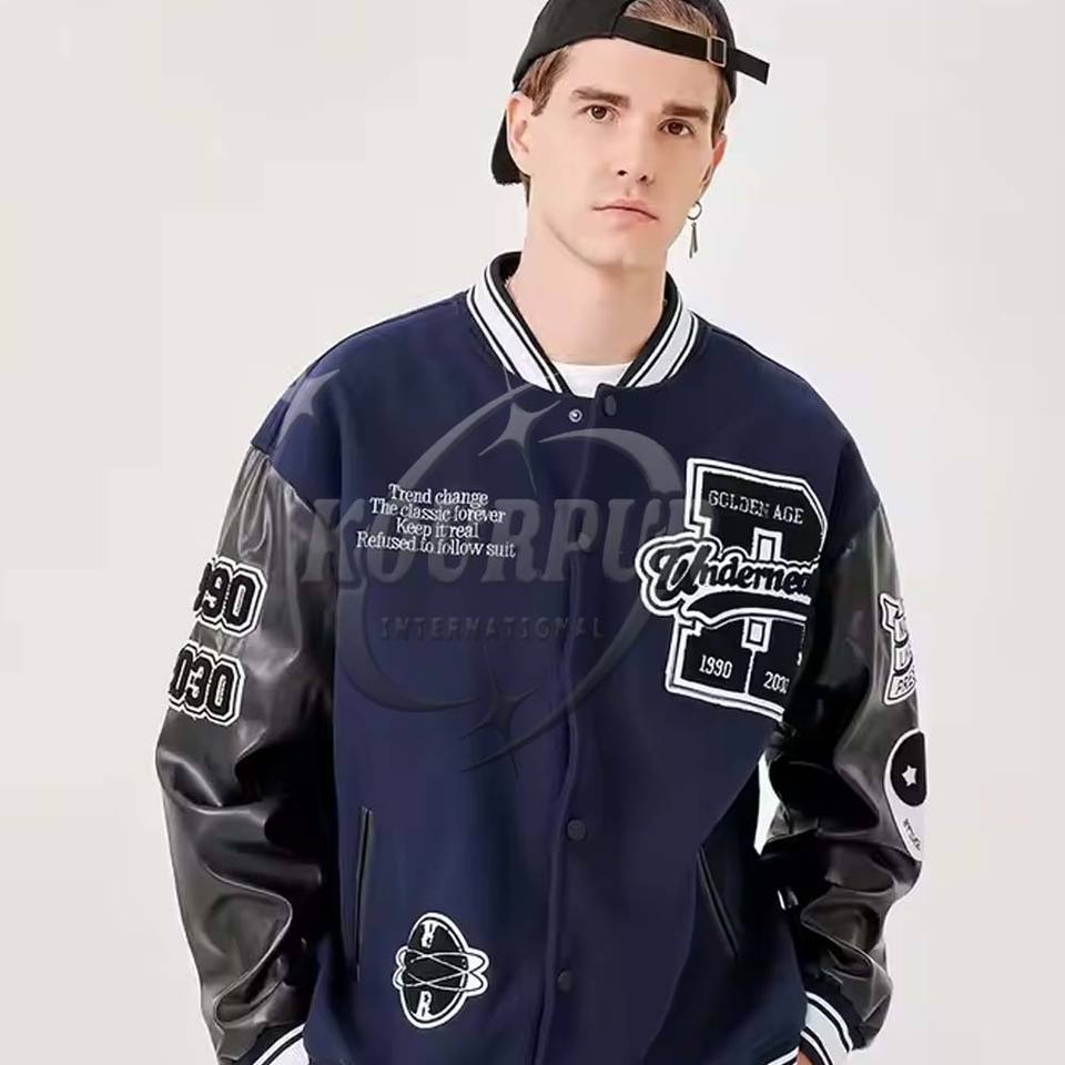 เสื้อแจ็กเก็ตเบสบอลผ้าขนแกะสำหรับผู้ชายเสื้อแจ็กเก็ตโค้ชสำหรับฤดูหนาวงานปักด้านหน้าแนวสตรีทแวร์