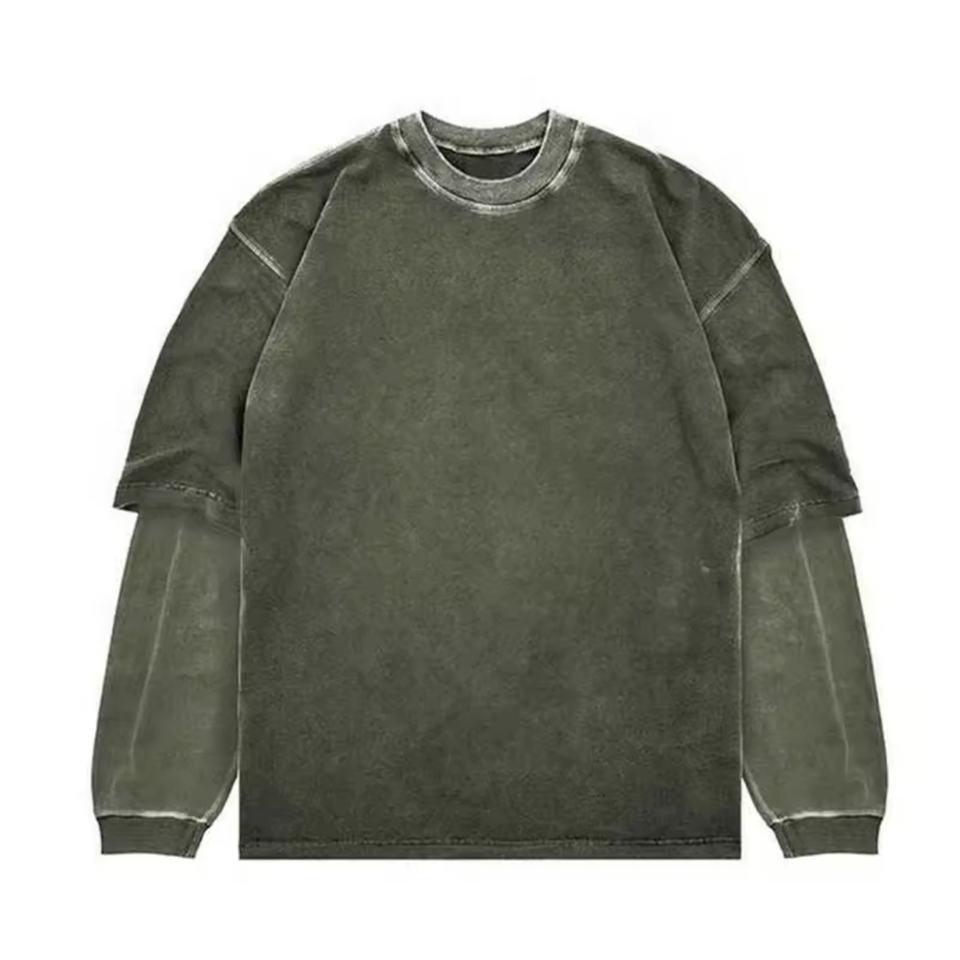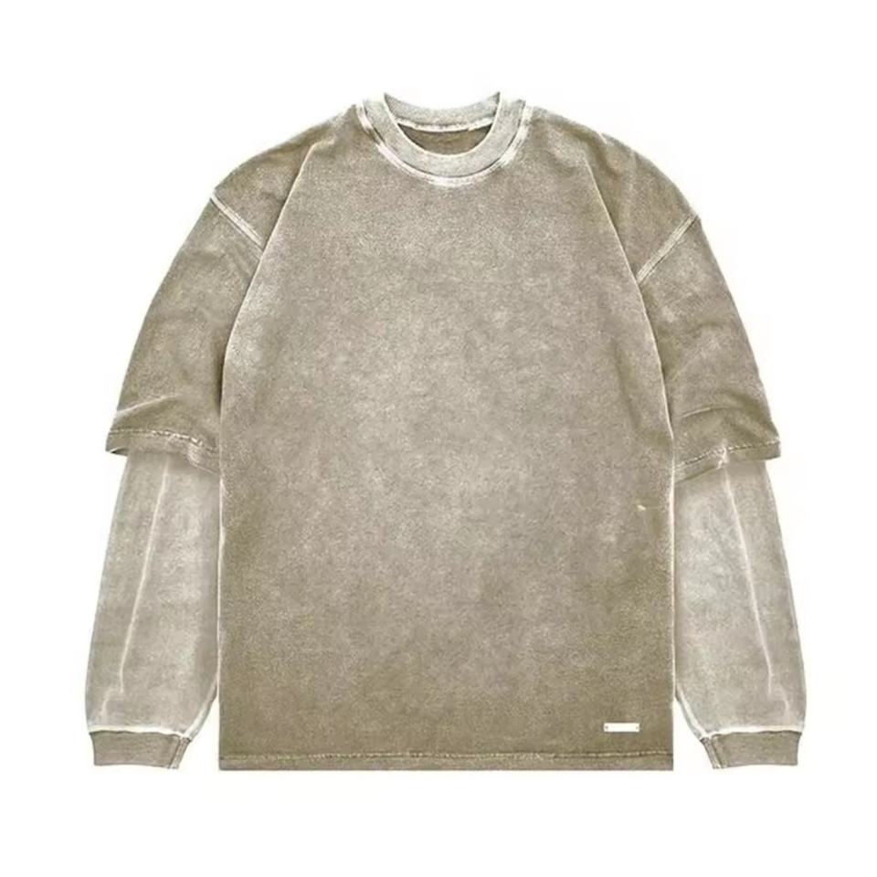 เสื้อยืดแขนยาวผู้ชายสไตล์วินเทจแบบลำลองสั่งทำพิเศษจากโรงงาน (OEM) สีพื้นฟอกยีนส์ แต่งผ้าสองชั้นต่อกันแบบแพทช์เวิร์ค ตัดเย็บด้วยผ้าต่างสี