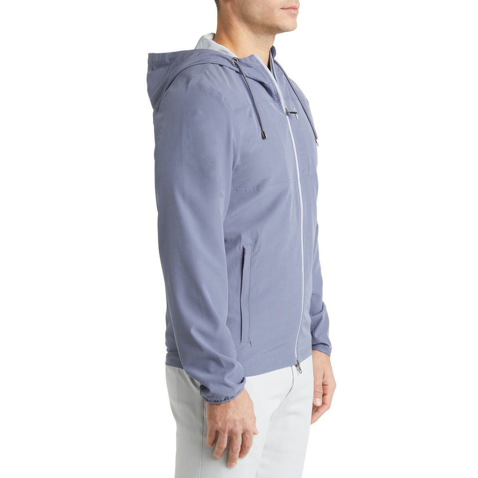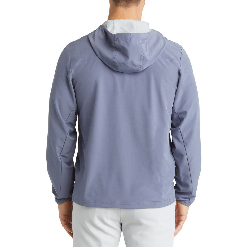 แจ็กเก็ตกันลมมีฮู้ดแขนยาวสำหรับผู้ชายสีพื้นสีฟ้างาน OEM ตามสั่งด้านหน้าสำหรับฤดูหนาว