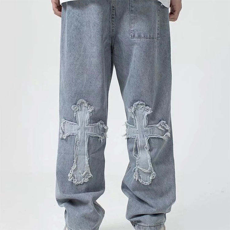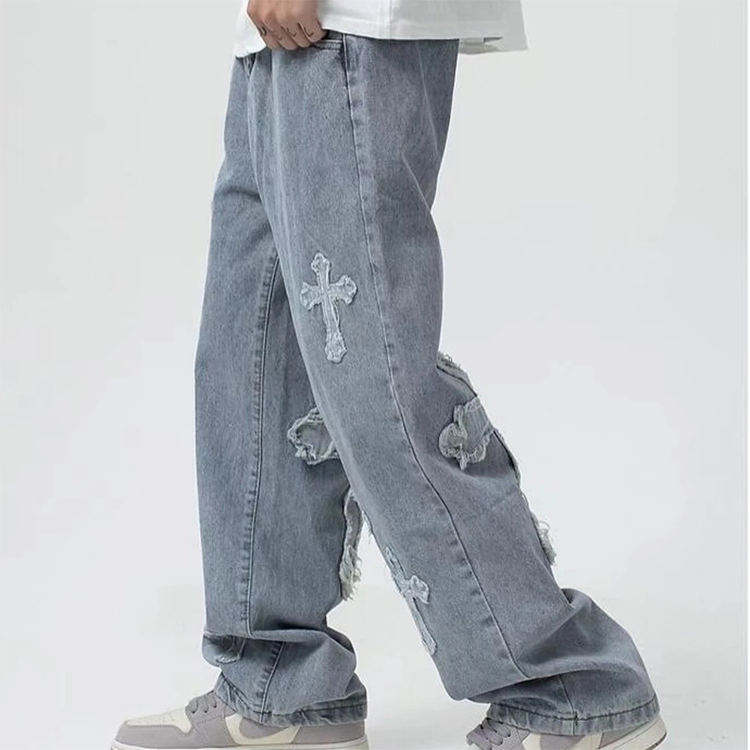 กางเกงยีนส์เดนิมทรงตรงผ้าฝ้าย 100% สำหรับผู้ชาย สไตล์ฮิปฮอปแบบ Boyfriend ระบายอากาศได้ดี น้ำหนักปานกลาง ปักลาย รับผลิตตามแบบ OEM