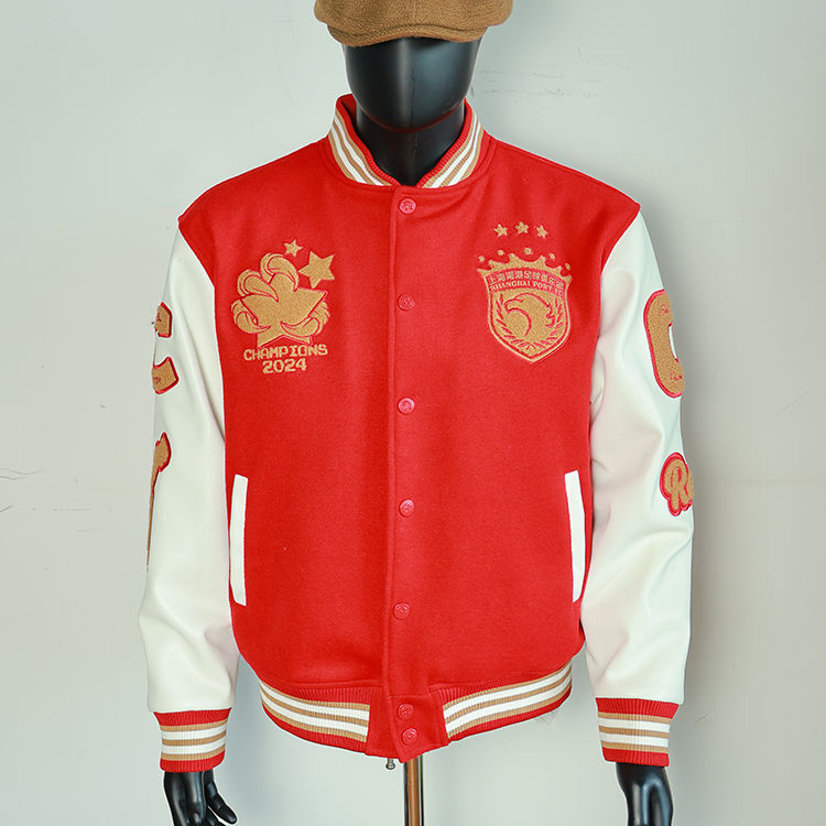 แจ็คเก็ตวาร์ซิตี้สีแดงสำหรับผู้ชายแบบ OEM แจ็คเก็ตวาร์ซิตี้หนาสำหรับฤดูหนาว ขายส่ง พร้อมงานปักแบบกำหนดเองและแขนหนัง