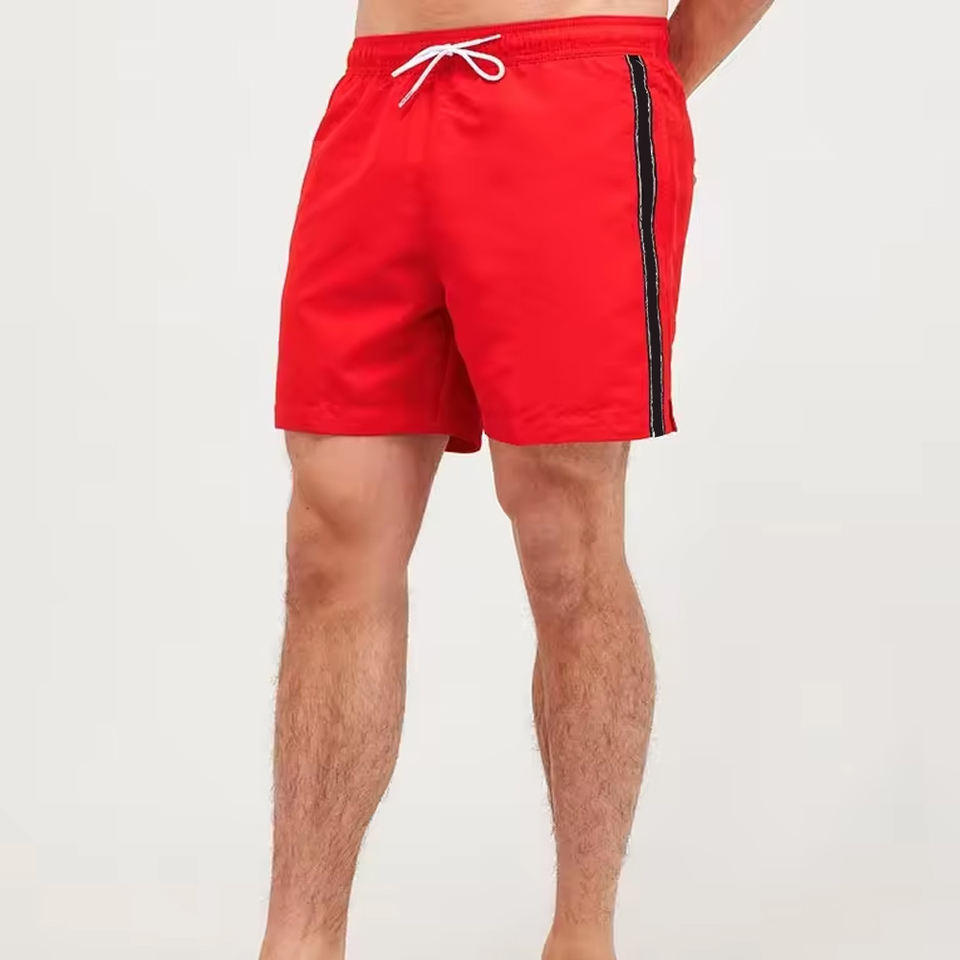 กางเกงขาสั้นชายหาดสีทึบของผู้ชายกางเกงขาสั้นสไตล์ลำลองขนาดกลางปรับแต่งได้เองขนาดผู้ใหญ่100% ผ้าใยสังเคราะห์ย้อมสีล้วน