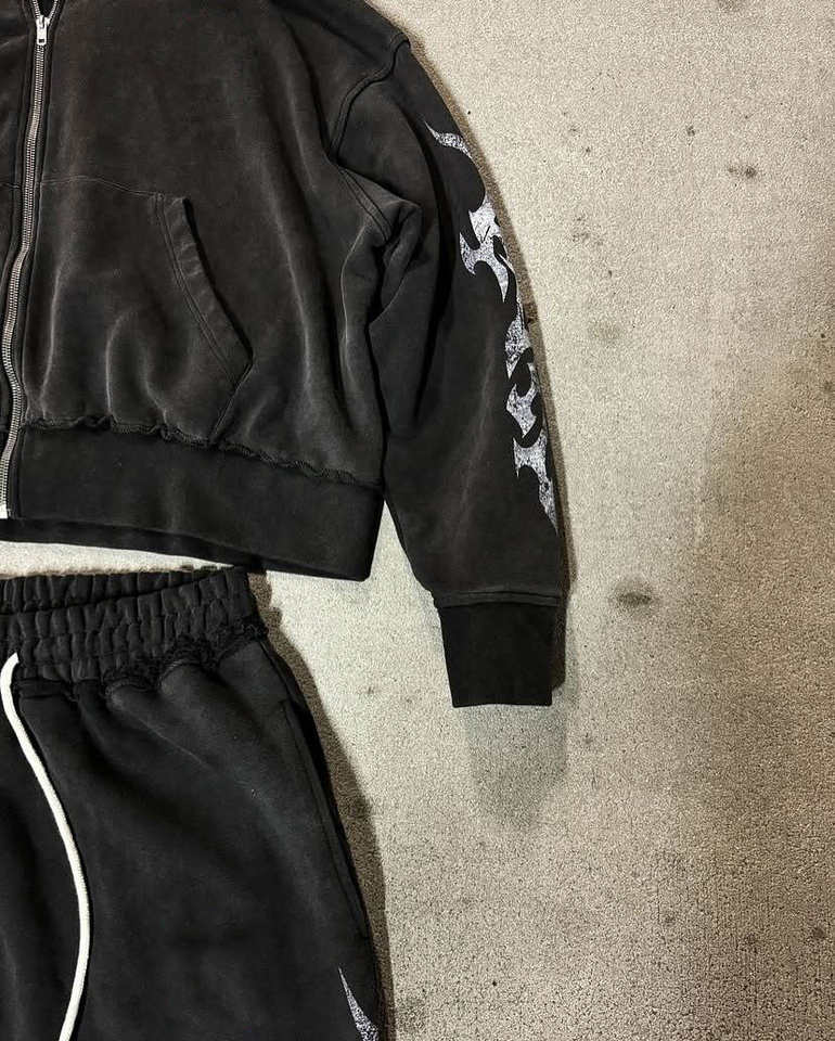 ชุดเซ็ตเสื้อผ้าผู้ชายแบบสองชิ้นสั่งทำพิเศษจากโรงงาน (OEM) ผ้าหนานุ่ม พร้อมงานปักลายขาดๆ บนกางเกงวอร์ม และเสื้อฮู้ดดี้ลายฟอกสีประดับคริสตัล